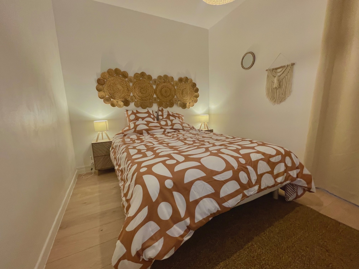 Stanovanje s površino 80 m2 se nahaja v majhnem stanovanju z 9 stanovanji. - 1 spalnica s kakovostno posteljnino za dve osebi. - 1 prha s prho in ogledalom, povezanim z Bluetoothom. - 1 opremljena kuhinja. - 1 zasebno parkirno mesto. - 1 terasa s pogledom na čudovito gozdnati park - Kajenje je najboljše na terasi - Ne smete presegati števila oseb, navedenega ob rezervaciji. Hitra internetna povezava.