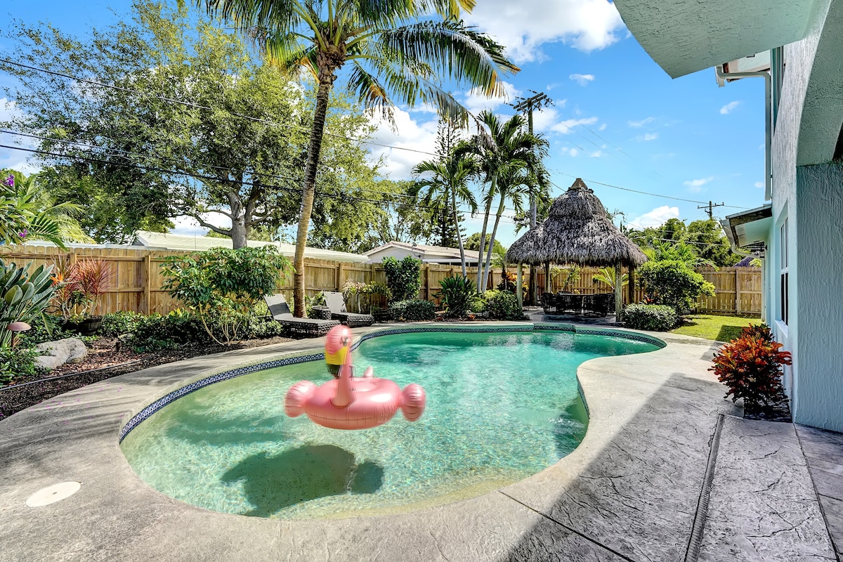 Ta RAZKOŠNA in ČISTA 3 postelja 3 kopalnice z ogrevanim bazenom + zunanjim barom+ Tiki Hut! 20 minut vožnje od letališča Fort Lauderdale + 10 minut do plaže! 700FT stran od 10+ restavracij in več trgovin z živili! Naše prenočišče ima vse, kar potrebujete na dosegu roke. Oprema vključuje tudi: brezplačen kavni bar, popolnoma opremljeno kuhinjo, 70 in 4K pametne televizije z HULUJEM, NETFLIXOM, DISNEYJEM + BREZPLAČNO, ležalnikom/plažnimi stoli in udobnimi, VRHUNSKIMI NOVIMI BLAZINAMI SERTA in novim, kakovostnim pohištvom.