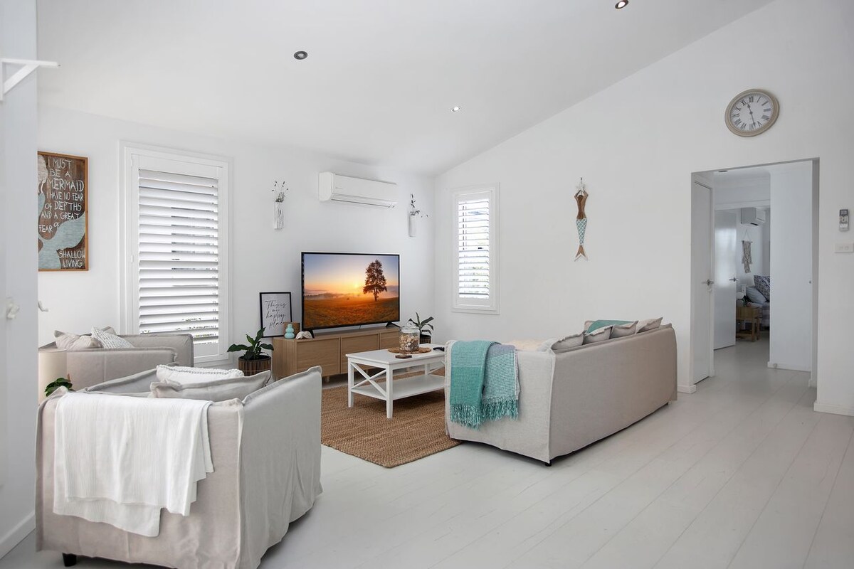 Our home is the perfect spot for your next holiday. It boasts a beautiful kitchen with loads of space and walk in pantry. The kitchen is fully equipped with dishwasher, microwave and other handy kitchen appliances, tea, coffee and sugar. Bright and airy the home has an open plan lounge/dining area to relax in and opens on to a side deck and spacious landscaped front courtyard with BBQ. It boasts 3 upstairs bedrooms with main bathroom and downstairs bedroom with ensuite, 3rd toilet in laundry.