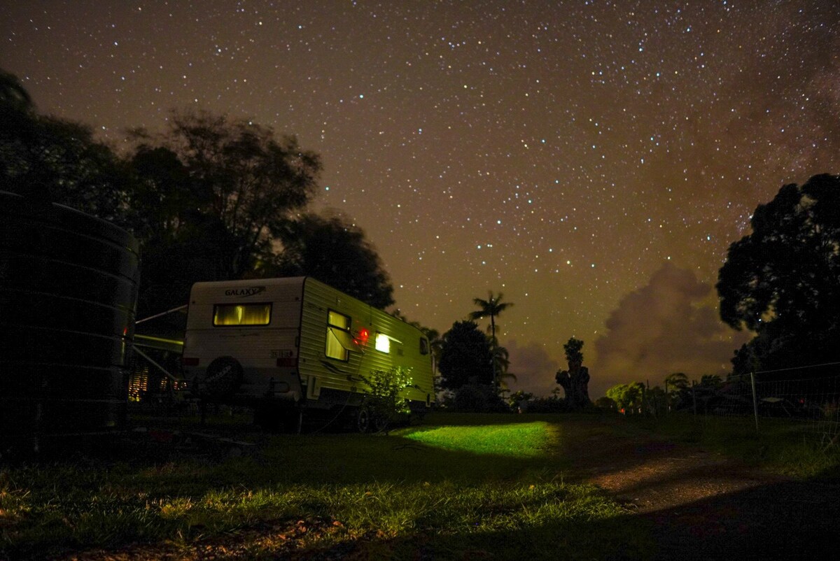 BELLO RETRO - Original 11ft retro caravan with share guest bathroom (toilet, shower & vanity) a short walk to our back garden. PLEASE NOTE: There are two other tiny air bnbs within close proximity to Bello Retro and our home. You may see or hear other guests coming and going This should not affect your stay in any way. This funky retro super teeny tiny home on wheels is suitable for solo travellers visiting our beautiful Bellingen town. Situated an easy 15min walk to town, or a 2-3min drive.