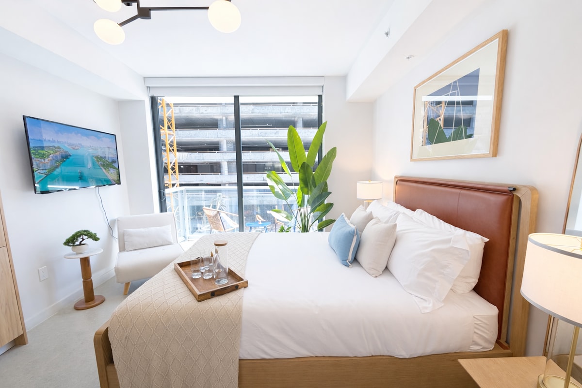 Wake up in a bright, brand-new studio high above Downtown Miami. Floor-to-ceiling windows fill the space with light, and your private balcony becomes the perfect spot for coffee in the morning and skyline views at sunset. You’re not just booking a studio — you get access to a rooftop resort pool, premium gym, coworking lounge, and social rooftop spaces that feel like a private club. Ideal for solo travelers, couples, and business stays who want location, comfort, and amenities in one place.