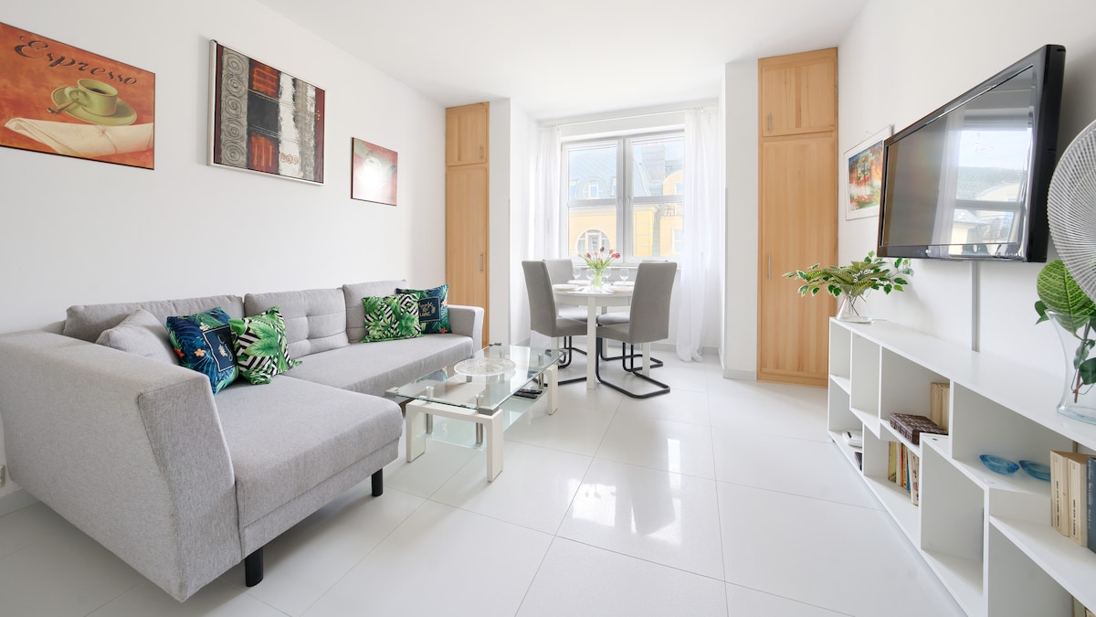 Savna – masažna kad – masažni stol – 2 x 75-palčni TV – 1 x 65-palčni TV – Wi-Fi – ledomat – sef – popolnoma opremljena kuhinja – poljska TV Naše 70 m² veliko stanovanje se nahaja neposredno na promenadi Dziwnow in lahko sprejme do 4 osebe. 150 metrov do morja in 100 metrov do novo zgrajenega pristanišča Dziwnów. V neposredni bližini boste našli sodobno otroško igrišče in zelo dobro urejen park z različno zunanjo športno opremo.