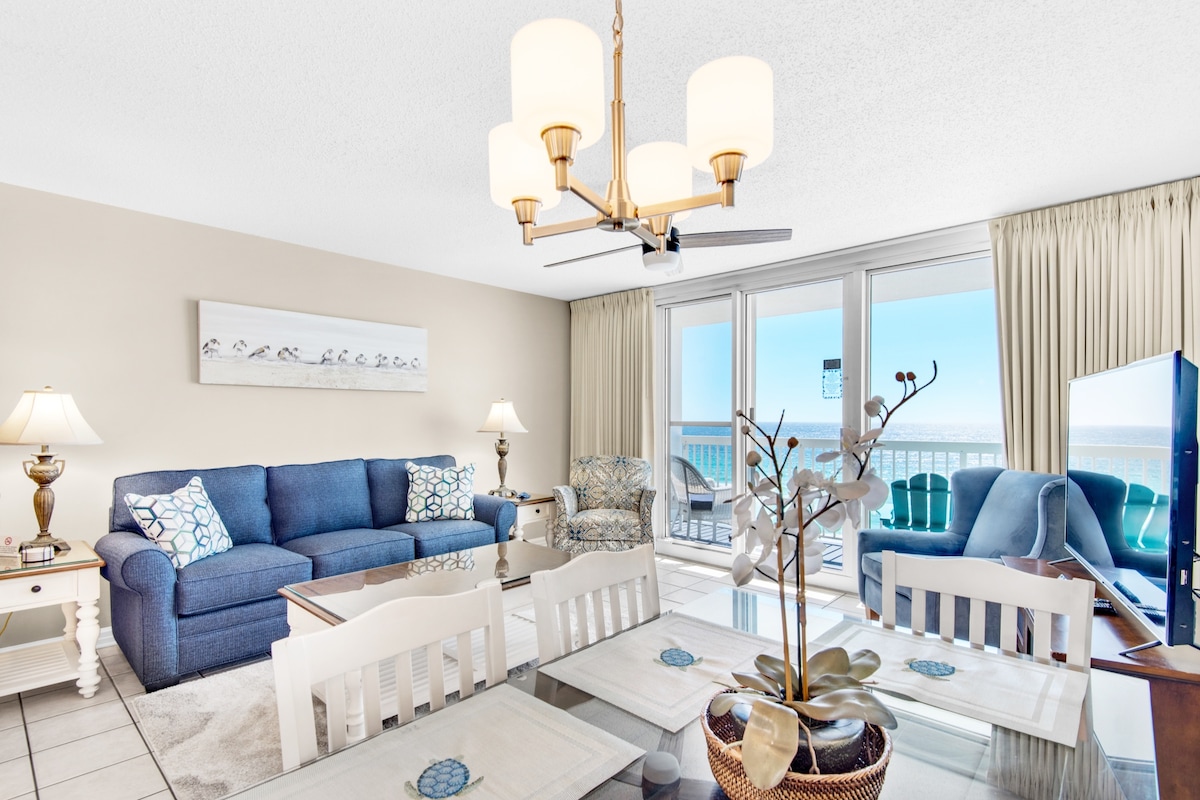 Elegantno stanovanje 1BR/2BA v Majestic Sun s čudovitim razgledom na zaliv s prostornega balkona v 10. nadstropju. Elegantno opremljen z obalnim pridihom vključuje veliko zakonsko posteljo, kopalnico v spalnici, pograde na hodniku z lastno televizijo z Netflixom in raztegljivim kavčem z zakonsko posteljo. Uživajte v popolni kuhinji, hitrem Wi-Fi-ju in televizorjih v vsaki sobi. Nahaja se v stavbi A v bližini pokritega parkirišča z enostavnim dostopom. Gostje se iz leta v leto vračajo zaradi pogleda na ocean in plažo, udobja in nepozabnega doživetja na plaži.