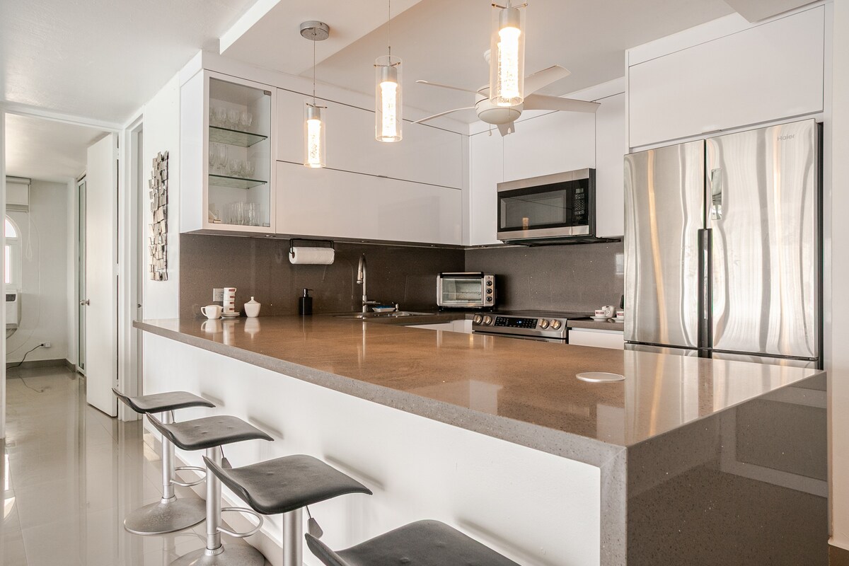 Nepremagljiva lokacija in zasebno parkirišče. Nahaja se na priročni lokaciji, le kratek sprehod od kongresnega centra, okrožja T-Mobile in glavnih hotelov, kot sta Hyatt in Sheraton. Le 10 minut vožnje od mednarodnega letališča Luis Muñoz in hitra 10-minutna vožnja do zgodovinskega starega San Juana Ne glede na to, ali iščete sproščujoč oddih na plaži, urbano pustolovščino ali kombinacijo obeh, vam bo tukaj všeč. (In poleg tega ni več gradnje v sosednji stavbi)