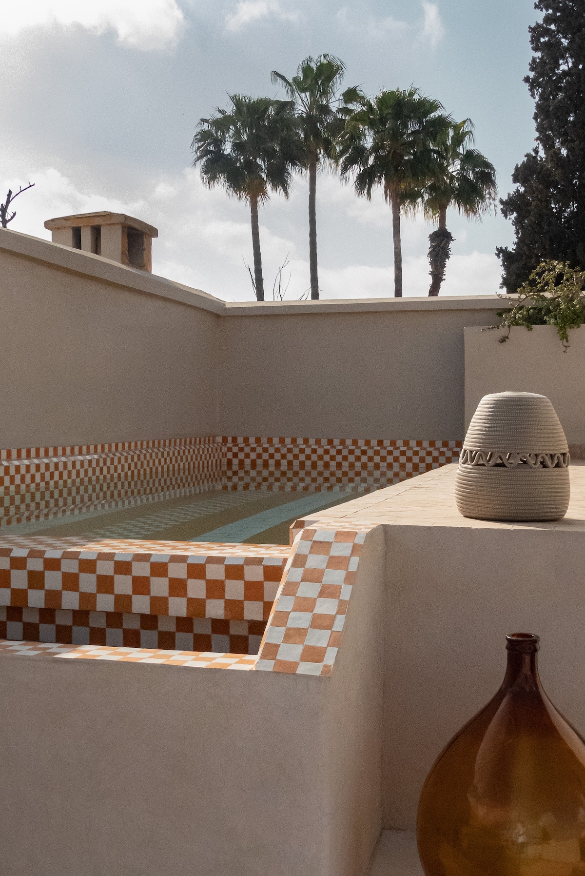 Kick back and relax in this calm, stylish space. This memorable riad is anything but ordinary with a chic design approach centred around a circular patio and staircase whose walls have been clad in a mesmerising arrangement of traditional red bricks. To balance this design feature the rest of the riad has been finished with off-white tadelakt and white bejemat tiles. The place feels both light and airy, and the beautiful rooftop terrace includes a pool to soothe the senses.