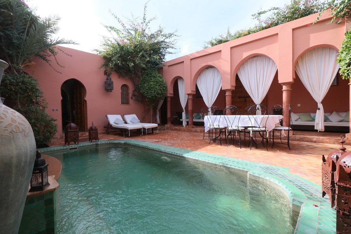 Luksuzna vila v središču Marakeša. Sprostite se v vzdušju s čistim in sončnim bazenom, ki ga vzdržujete skozi vse leto. Brezplačen zajtrk z bivanji, ki trajajo najmanj sedem nočitev. Supermarket, pekarna, spa in restavracije so le nekaj minut vožnje stran. Šest velikih spalnic z zasebno kopalnico, hamamom, parkiriščem... Upoštevajte, da za skupine z več kot šestnajstimi osebami veljajo dodatni stroški. Sprejme do 24 oseb. Samo za družine in skupine strokovnjakov. Hafid . Lastnik