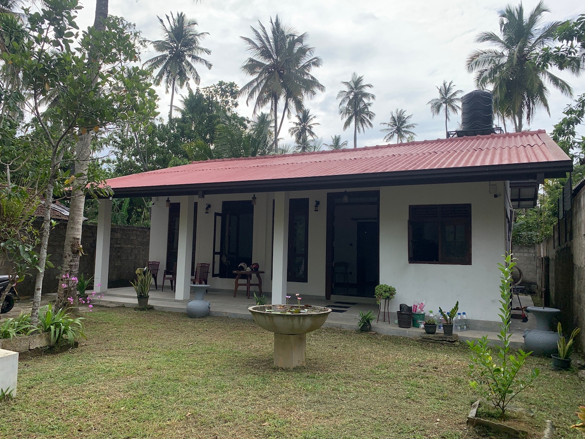 Hi-Speed Fibre Internet for remote workers.....Luxurious home suitable for families with small kids boasting a large tropical garden enjoying country & sunrise views. 3 x Spacious Air Conditioned double bedrooms, a modern indoor kitchen, 2 x bathrooms, an outdoor shower, an open plan living area, and a terrace for Al Fresco dining. The garden is a paradise for nature and wildlife such as monkeys, chipmunks, peacocks and the occasional spider. We are approx 6-8 min walk from Mirissa Beach.
