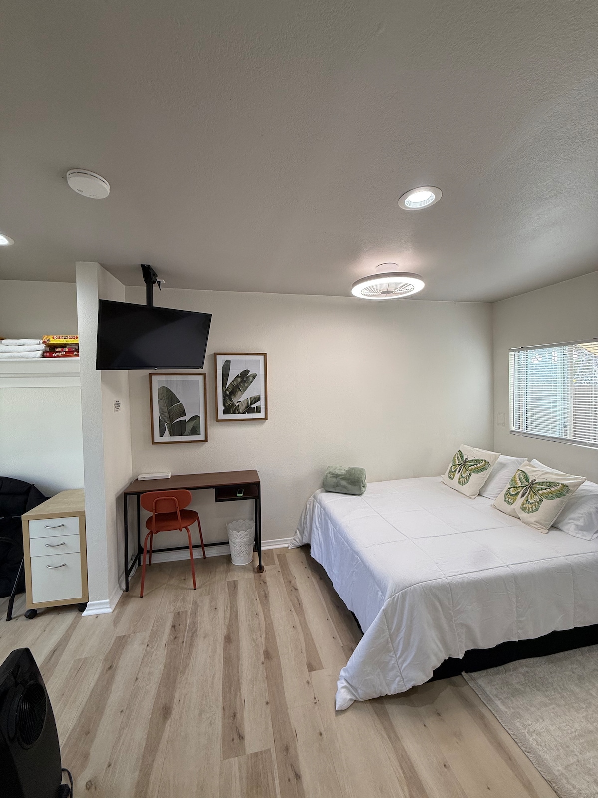 Poskrbite, da bo vse preprosto v našem mirnem studiu, ki se nahaja v središču mesta. Zasebni samostojni studio smo ustvarili z mislijo na mir in udobje. Minimalistična je, saj je čistoča naša največja prednostna naloga. Imate svoj zasebni vhod in prostor, da se boste lahko sprostili v miru. Gre za prostoren studio z zakonsko posteljo (Queen), pametno televizijo in kuhinjsko nišo z mikrovalovno pečico, hladilnikom in aparatom za kavo. Ima tudi majhen delovni prostor z mizo in pred kratkim prenovljeno kopalnico s prho.