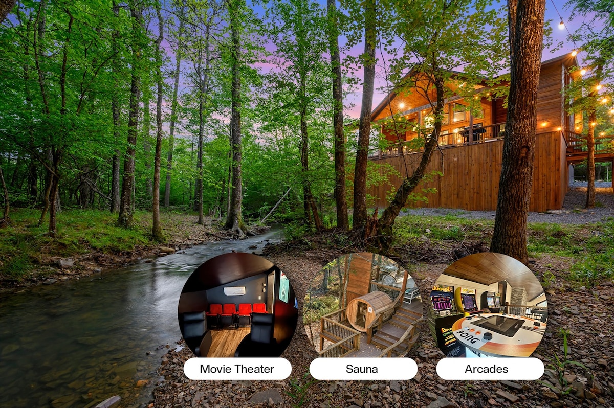 Our cabin offers the ultimate escape for those seeking privacy and tranquility. We also have amenities galore for different age groups. 🎬 Movie Theater 🎮 5 Arcade machines 🛁 Big Hot Tub + Barrel Sauna 💦 Seasonal Creek 💺 Massage chair 🛏️ 2 Kings + Bunk- Sleep 10 ⛳️ Zipline, Mini golf,Slide, Swings,Hammock 🥅 Foosball, Pool Table & Shuffleboard 🕹️ Corn hole +Arcades 🔥 Fire-Pit 🍳 Fully Equipped Kitchen