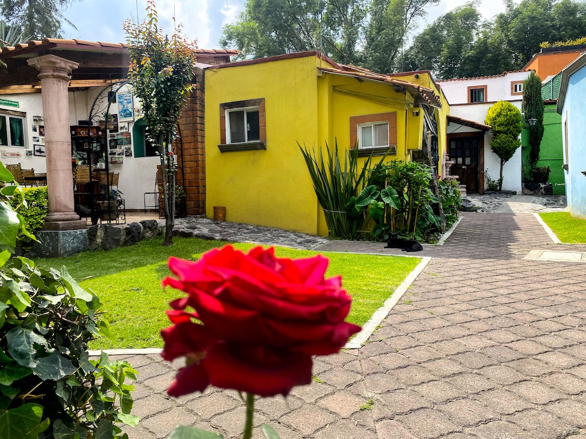 Bienvenidos a Coyoacán! Nuestra habitación se encuentra en una típica casa coyoacanense, a dos cuadras del Centro Histórico de Coyoacán, uno de los más tradicionales y visitados de la Ciudad de México. Gracias a su perfecta ubicación, podrás llegar a pie a cualquiera de los múltiples museos, plazas, jardines, librerías, galerías, bazares, mercados y restaurantes que te ofrece el pintoresco Centro de Coyoacán.