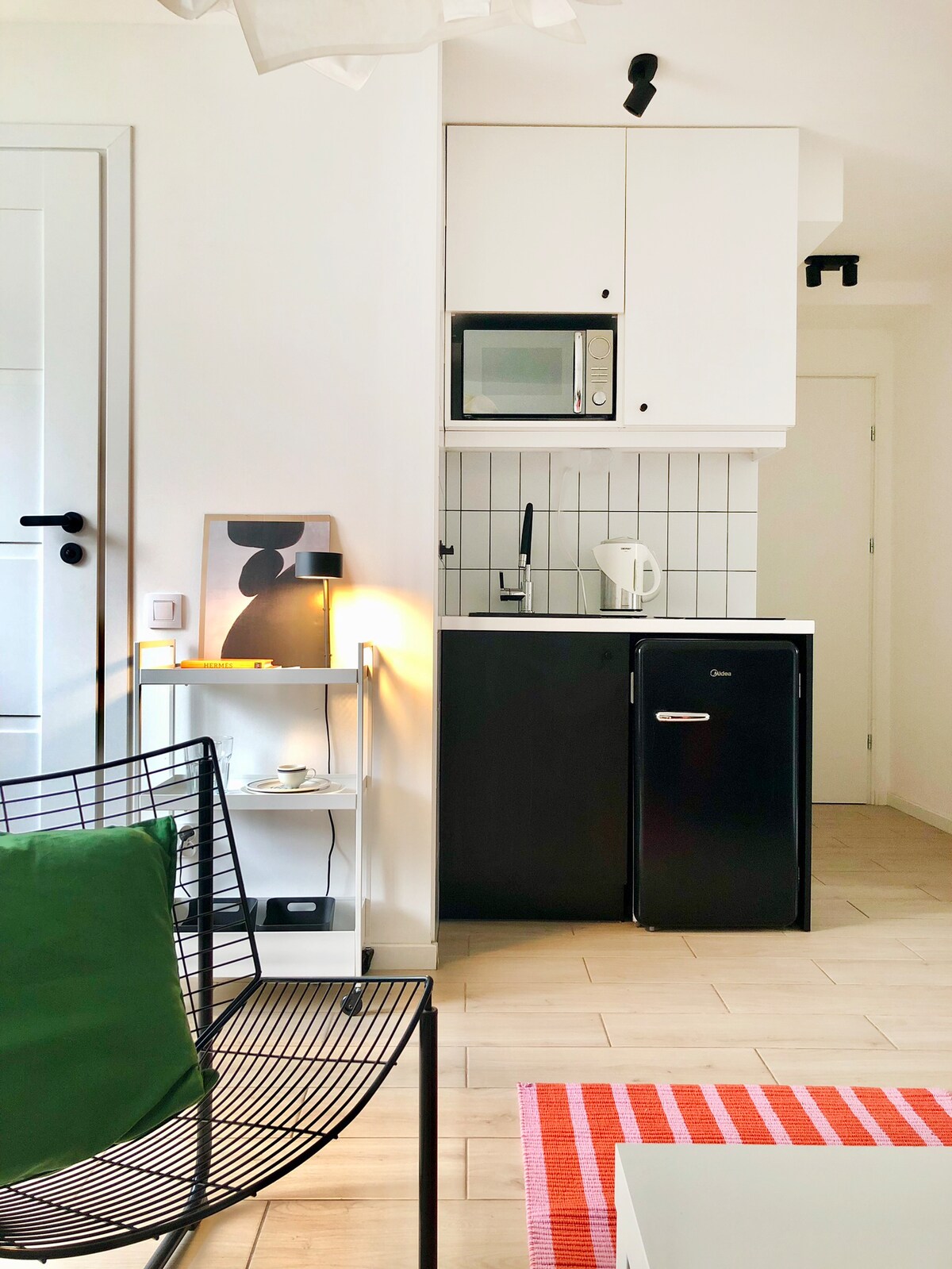 Design studio in strict Warsaw city centre, great panoramic view. Fully equipped kitchen (cooker, microwave, big fridge with freezer); bathroom (bathtub, washing machine, iron, towels, shampoo); comfortable bed with linen, 600Mb wifi, cable TV and other Old Town and 23 museums, Central Railway Station - 20 min/walk, Chopin Airport 25 min/taxi, Subway/buses/trams 3 min/walk 24/7 check in, no additional charge. Close to 20+ restaurants, 2 grocery stores just by the door! Wheelchair friendly