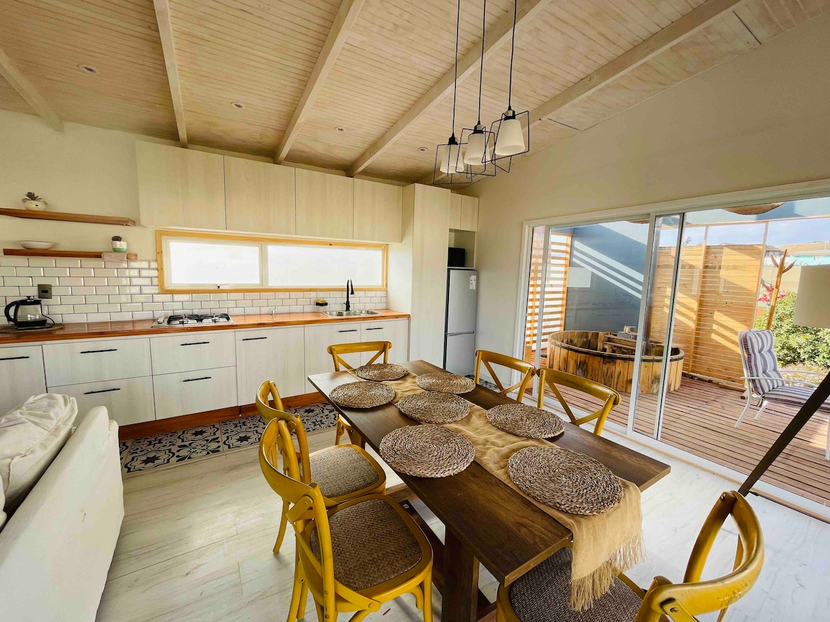 Relájate en esta escapada única y tranquila, a 20 minutos (14 km) desde el centro de La Serena. En esta hermosa casa encontrarás todo lo necesario para desconectarte de la ciudad, y llenarte de energía con una maravillosa cama de cuarzo a tu total disposición. ideal para hacer teletrabajo, ya que cuenta con conexión a internet (Starlink). Para el uso de la tinaja se paga un adicional por el uso de leña.