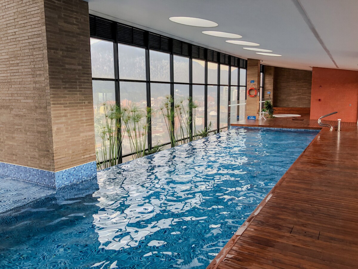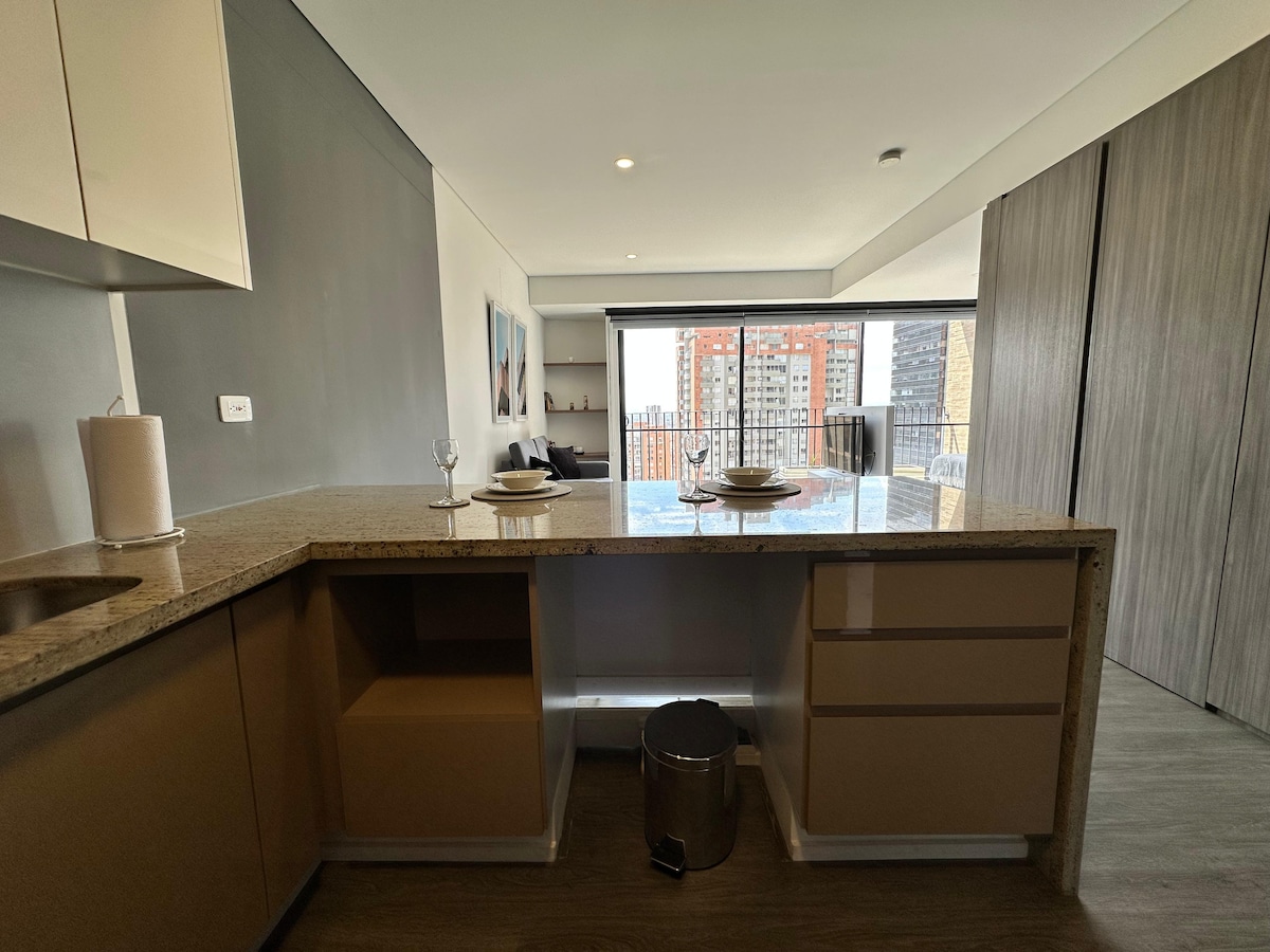 Očarljiva suita v osrčju Bgtája, idealna za pare ali popotnike. Elegantna dekoracija, opremljena kuhinja in udobna zakonska postelja. Zasebni balkon z osupljivim razgledom, družabni prostori, kot so območje Lavado, telovadnica, biljardna miza in namizni tenis, CoWo, terasa za žar v zgornjem nadstropju s 360-stopinjskim razgledom in 24-urnim varovanjem. Blizu tržnic, muzejev, restavracij v La Macareni, Monserrate, La Candelaria, Mall San Martín in Centro Internacional. Odkrijte najboljše, kar ponuja Bogota iz te čudovite obleke!