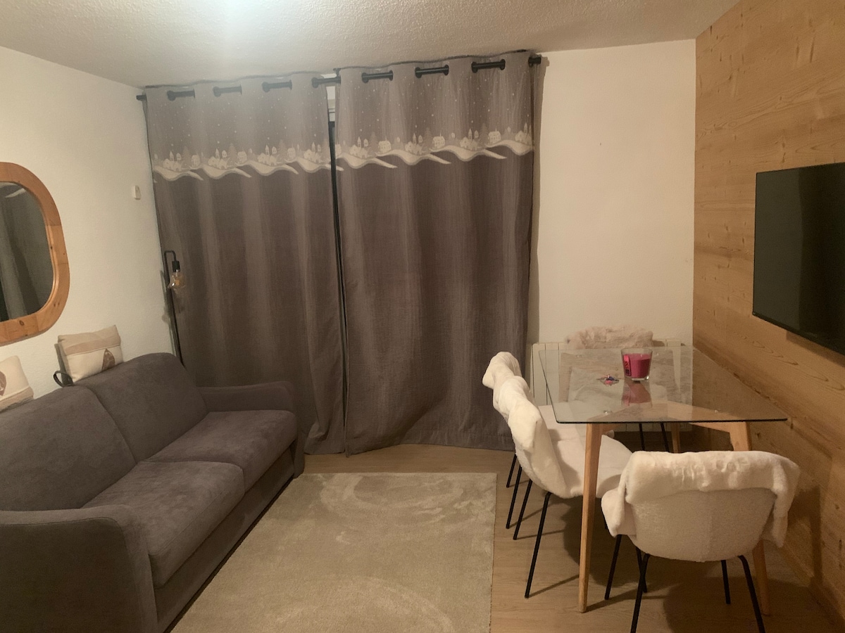 Idealno za odhod z povratnimi smuči ob vznožju Jandri v rezidenci Vallée Blanche Tedenski najem za 7 dni Najem majhnega studia za 2 osebi 13 m 2 v celoti prenovljen novembra 2021 z okusom, ki ga sestavljajo 2 raztegljiva postelja velikosti 80 cm, ki je lahko ena ob drugi in tvori zakonsko posteljo (Queen) Mikrovalovna pečica, Nespresso aparat za kavo, aparat za kavo, mikrovalovna pečica, hladilnik, Wi-Fi TV Prha Shramba za smuči Zasebno parkirišče tedenski zakup