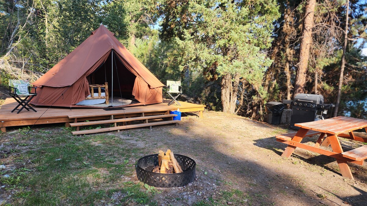 7 miles from the West entrance of Glacier National Park, this is perfect for couples that plan to be spending most of their time in Glacier. 12x14 wall tent with a wood burning stove for chilly nights! 1.5 acres. Private Entrance, all fenced. There is a solar panel to plug in essentials, and a camp stove and fire ring for cooking. We provide a cooler and a water. There is an outhouse with a propane heated shower. Not for light sleepers! The train comes by a couple of times a night.
