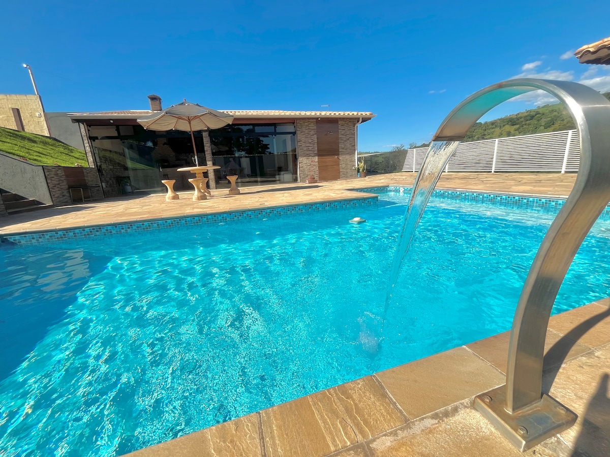 Ekskluzivna hiša z neverjetnim razgledom, žarom, 3 apartmaji z balkonom, ki gleda na bazen, glavna s kadjo, zakonsko posteljo (Queen) in klimatsko napravo. Hiša ima Wi-Fi, samostojni vstop, zvočnike, dnevno sobo s kaminom in pametno televizijo. Nahaja se na vrhu gore z nebeškim razgledom. Varno bivališče, obdano z zaslonom, trajnostno, 100% električne energije, proizvedene tukaj in samodejnimi vrati. Vaš hišni ljubljenček se lahko sprehodi po celotni namestitvi (2000 m2).