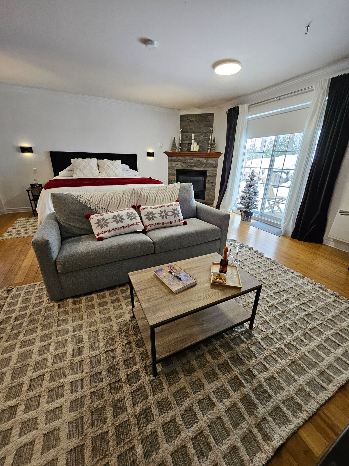 Pojdite na romantičen konec tedna ali pa se z družino odpravite v vrhunski, klimatiziran razkošen apartma, ki se nahaja v drugem nadstropju hotela St-sauveur. Pojdite z dvigalom v romantično sobo s plinskim kaminom, teraso, Wi-Fi, espresso barom in popolnoma funkcionalno kuhinjo. Nahajate se v osrčju St-sauveurja s številnimi znamenitostmi. Sprehodite se po ulici Principal Street. Od smučišča vas loči le nekaj minut, kolesarjenja, restavracij in veliko nakupov.