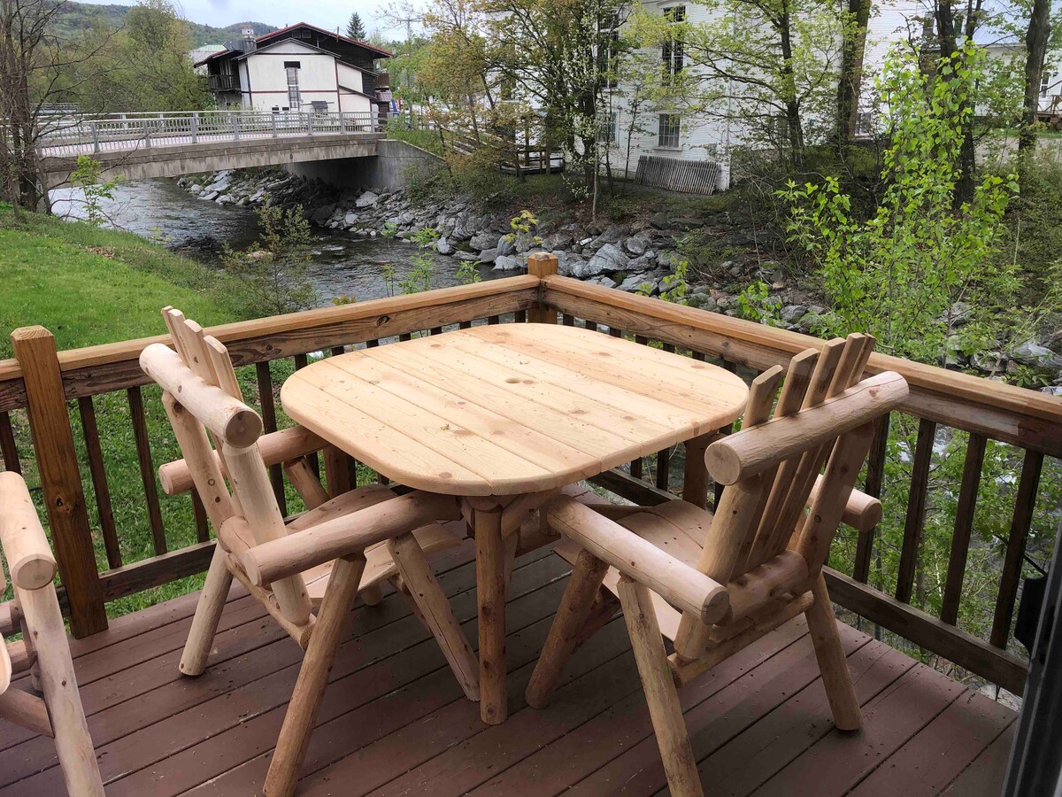 Welcome to the Trout River Lodge! Check out the “Three Holes” swimming hole and waterfalls, just a few hundred yards up the river. We are located right in the heart of Montgomery Center, VT. Live music at the Snowshoe Pub, breakfast at Bernies, and groceries from Sylvester’s are all just steps away. You can also enjoy the mountain biking and hiking trails just minutes away! ***Discount vouchers for Jay Peak Ski. Price info can be found in the Photos section. It changes each year***