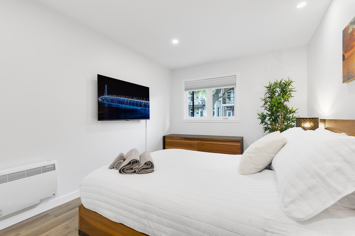 Welcome to our stylish 1-bedroom unit in Little Italy, Montreal! Designed for comfort and convenience, our space is perfect for business travellers. Accessible by a common elevator in a well-maintained building, enjoy a charming atmosphere. Relax in a cozy queen-size bed, use the fully equipped kitchen, and unwind in the spacious bathroom and tub. Stay connected with free wifi, and Netflix, and enjoy a welcome starter amenity kit with fresh coffee and treats.