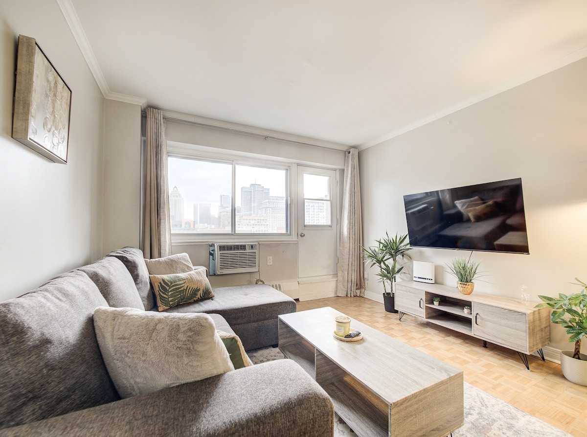 Welcome to your urban escape in the heart of downtown Montreal. This 2-bedroom, 1bathroom apartment combines sleek modern interiors with stunning city views, offering the perfect setting for both work and relaxation. Situated on lively Rue Mackay, you’ll be surrounded by trendy cafés, restaurants, and all the cultural energy that defines Montreal.