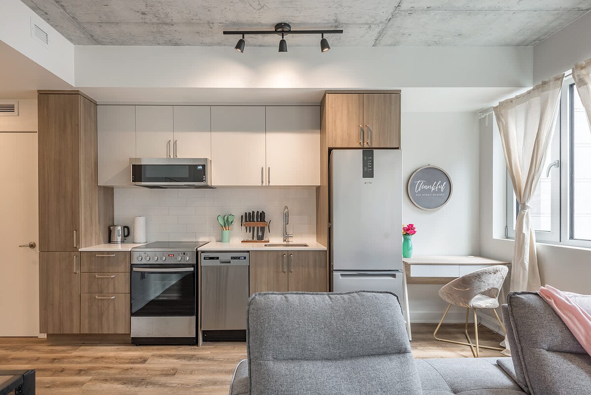 Enjoy a stylish experience at this centrally located place. Brand-new ultra-modern 1-bedroom apartment Relax in the private bedroom or use of the office area, which transforms into a cozy twin-size bed. The apartment also features a fully equipped kitchen, spacious living area, and modern design perfect for both work and leisure. Steps away from restaurants, shopping, and nightlife, you’ll have the city at your doorstep. Ideal for solo travelers, couples, small families, or business guests