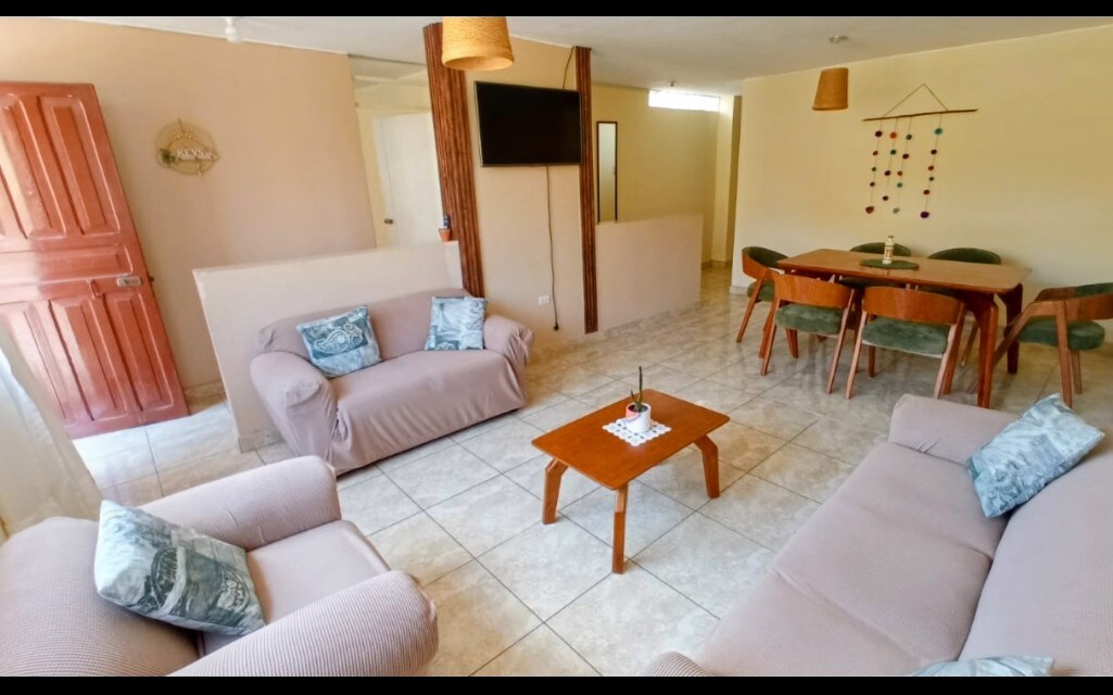 Relájate con toda la familia en este alojamiento, donde encontraras lo necesario para tus vacaciones. Queda a 5 minutos de la playa Boca del Rio y del centro de la ciudad, puedes traer a tu mascota y divertirte en las hermosas playas de Ilo. Te doy cochera para 2 vehículos, a una cuadra de la casa, es una cochera de un vecino, al que yo le rento, el guarda más carros, te doy su teléfono y coordinas con él directamente para guardar tus vehiculos