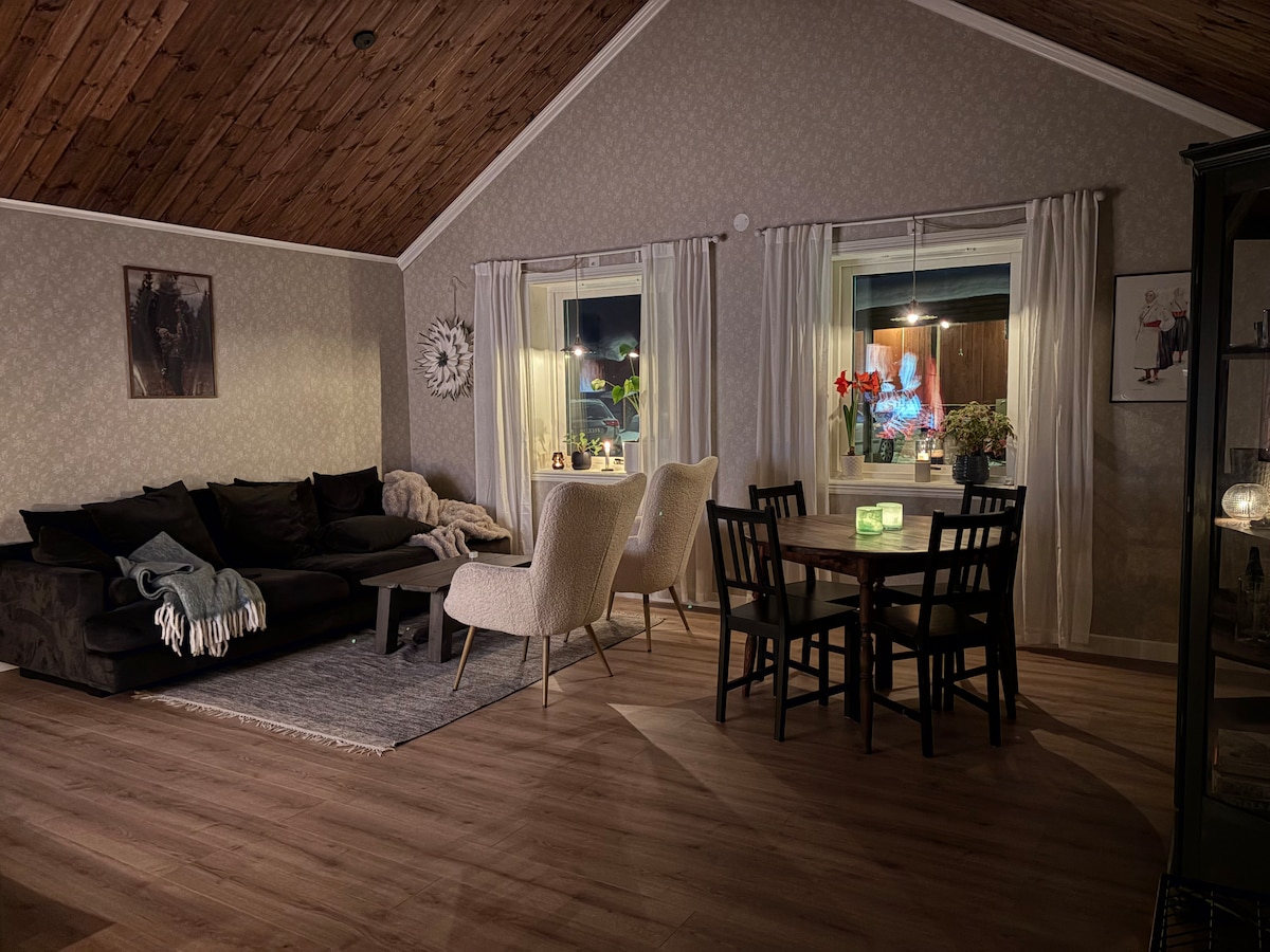 Velika hiša s prostorom za druženje! Celotnih 240 m2. Prostorna kuhinja s pogledom na celotno zgornje nadstropje. Zakonska postelja 210x210 in 180x200, pograd 80x200, 2 x 120 cm. Udobne vzmetnice! Raztegljiv kavč 160 x 200 z vzmetnico. Uživajte v večeru v Biorummetu ali pa morda sedite v hiški na deželi in se ogrejte pred kaminom. 2 prostorni kopalnici. Skupaj 3 stranišča. Na voljo je 3-fazni polnilnik za električni avtomobil. Vprašajte ga pred polnjenjem. 300 metrov do trgovin, ICA, Willys, Sibylla in Tesla Supercharger. 15 minut do Mora in Grönklitt!
