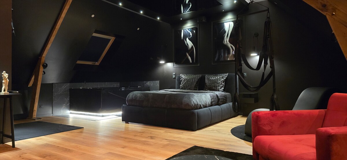 Dobrodošli v črnem apartmaju, predelanem stanovanju, ki se je spremenilo v ljubezensko sobo, okolje za čutnost in drznost. Ta suita, ki je zasnovana za pare, obdana s temo, ustvarja intimno in očarljivo vzdušje. Uživajte v zasebnem balneu za dva, stolu za tantro, ki bo prebudil vaše čute, erotični gugalnici in križu Saint-André za intenzivne trenutke. Velika 160-centimetrska postelja dopolnjuje ta prostor, ki je namenjen razkošju, zabavi in strasti. Doživite nepozabno doživetje.