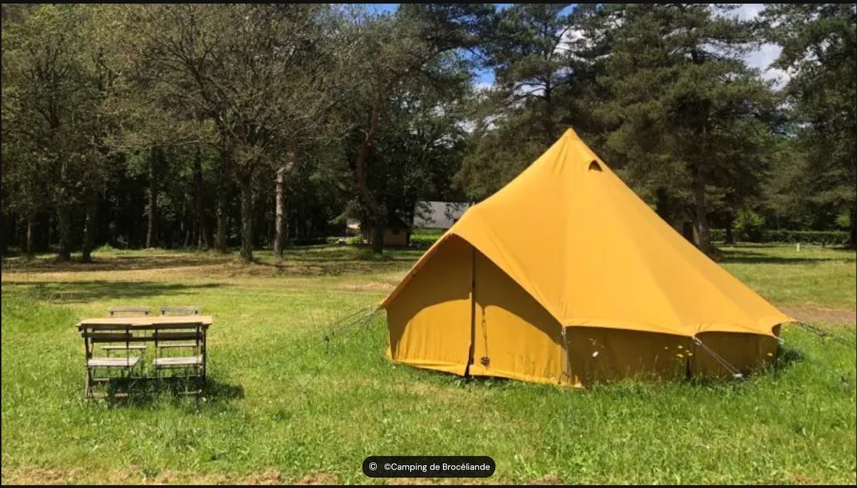 La Lancelot – tente médiévale moderne Tente jaune, offrant une atmosphère cosy et cocooning. Elle dispose d’un grand lit double et d’un lit simple, idéale pour un séjour en amoureux, en famille ou entre amis. Camping en pleine forêt de Brocéliande, à 2 km de Tréhorenteuc. Départs directs à pied ou à vélo, accès à un étang, guinguette estivale (repas maison, bio et locaux), sanitaires propres, espaces partagés et coin télétravail sous la verrière.