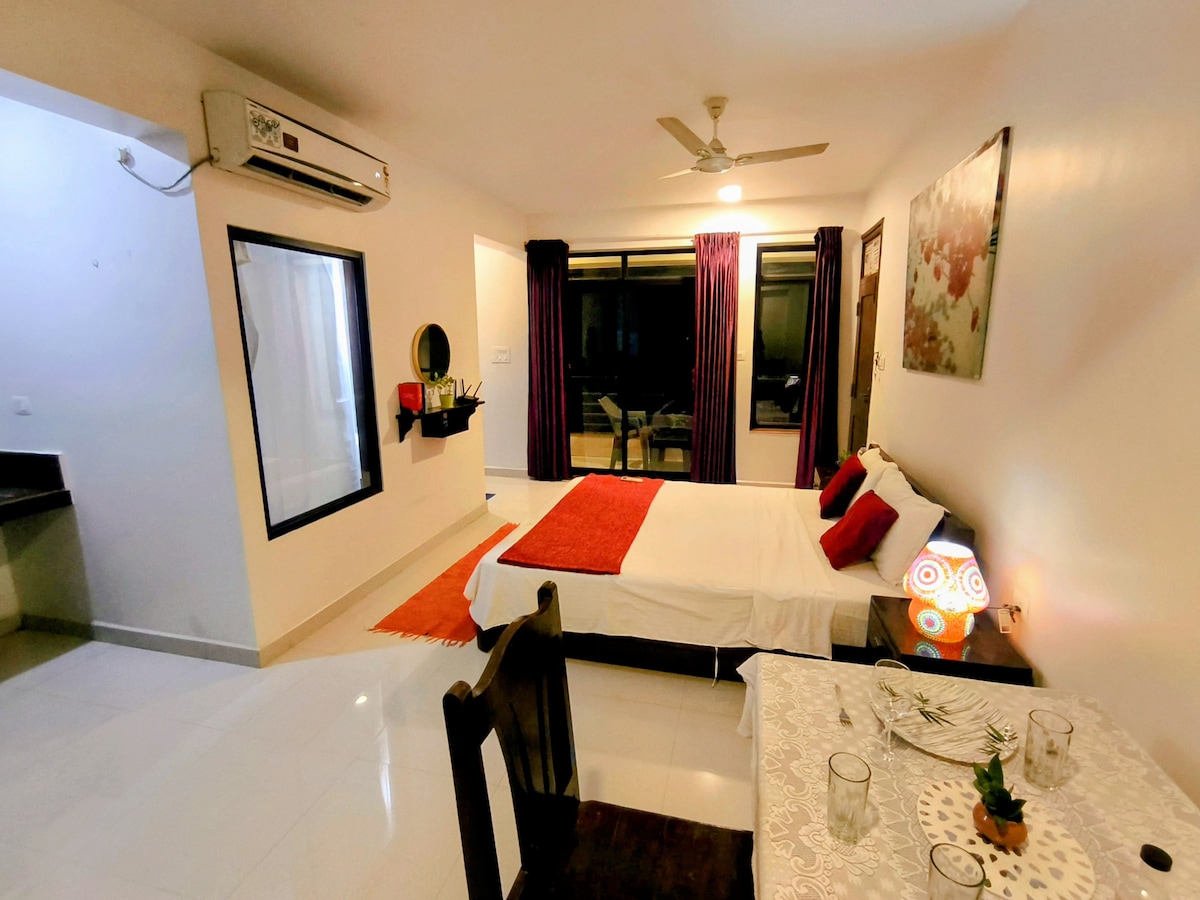 To sta 2 enoti naših luksuznih polovičnih garsonjer z bazenom v našem butičnem hotelu, ki združuje slog s preprostostjo in vam daje občutek »doma«. Vsaka od njih ima veliko udobno posteljo, v kateri bi se radi potopili, slastno hrano in vizualne užitke vsepovsod, Te sobe obljubljajo, da bodo ujele ne samo vaše oči, ampak tudi vaše srce. Nahaja se v osrčju Severne Goe, 5 min od nakupovalnega središča Mall De Goa, vse druge vroče točke, vključno s plažami, zabavnimi mesti, zgodovinskimi kraji itd., so oddaljeni približno 5-15 km.