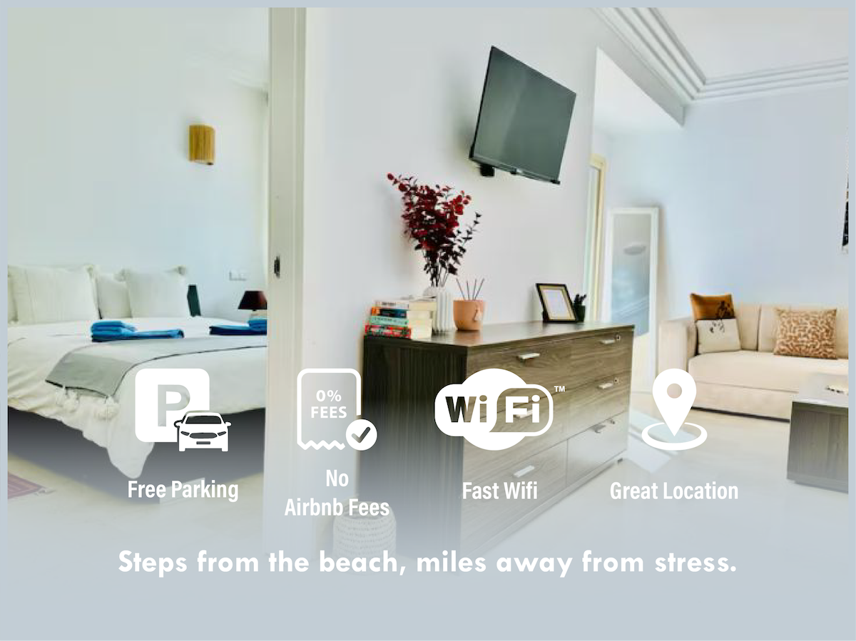 Novo stanovanje Ob plaži s spektakularnim pogledom na morje in 2 balkonoma. Prijeten delovni prostor z Wi-Fi internetom s hitrostjo 100 Mb/s prek vlaken. Medina, Souks, Restavracije in portugalsko mesto se nahajajo v središču mesta, pa so 15 minut hoje stran. Mestna plaža je oddaljena 20 minut hoje. PRM razmislite o taksiju. Dobro opremljen in skrbno urejen za udobno udobje in nepozabno bivanje. Uživajte v sončnem vzhodu, slikovitem razgledu, clapotisu ali miru. Čistoča, razpoložljivost in pomoč so zagotovljeni. Počutili se boste kot doma.