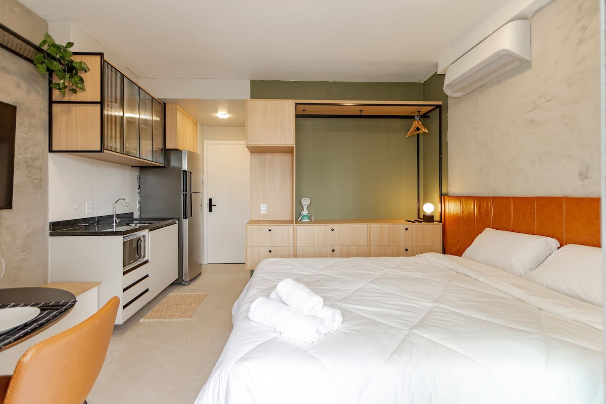 Predstavljajte si, da boste prispeli v São Paulo in bivali v praktičnem, organiziranem studiu, ki je zasnovan tako, da bo vaše bivanje preprosto in produktivno. Prostor združuje spalnico in dnevno sobo v minimalistični postavitvi. Ponuja zakonsko posteljo, pisalno mizo in klimatsko napravo za mirne noči. Opremljena kuhinja — s štedilnikom, hladilnikom, mikrovalovno pečico, grelnikom vode, aparatom za kavo Nespresso in osnovnimi pripomočki — vas vabi, da pred odhodom pripravite hitre obroke ali kavo.