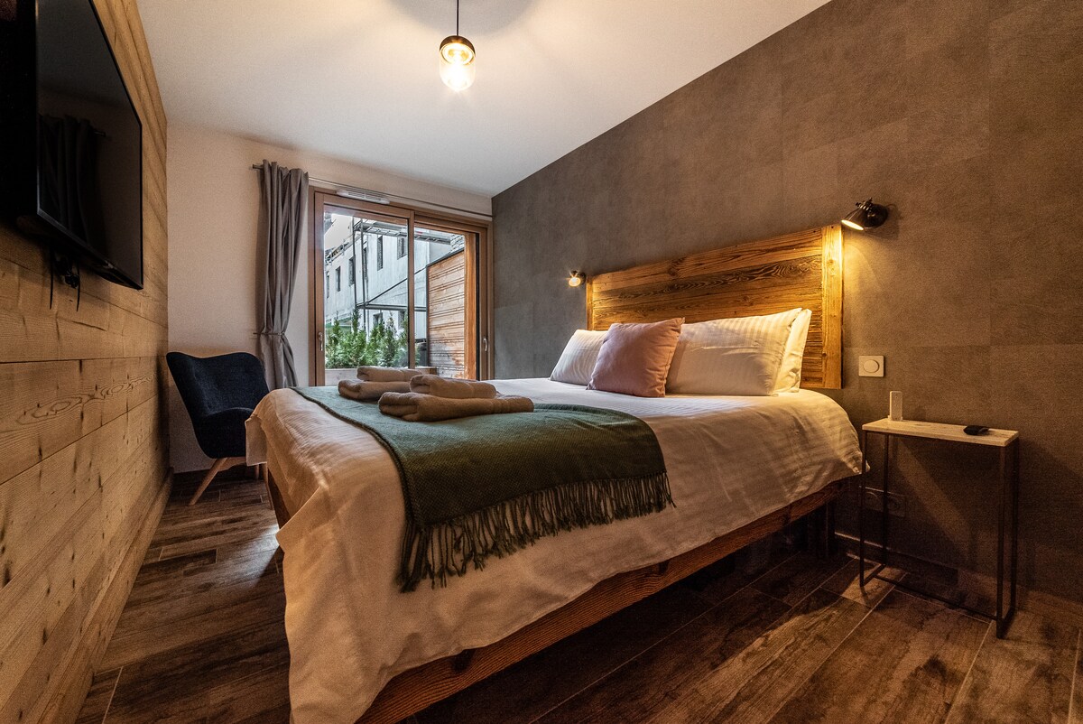 Novo luksuzno 2-sobno stanovanje v pritličju z veliko sončno palubo v samem centru Morzine. Le eno minuto hoje do glavnega dvigala Pleney z restavracijami, kavarnami in trgovinami tik pred vrati. Ključne funkcije • Podzemna garaža, ki se lahko zaklene (preko dvigala) - z dovolj prostora za shranjevanje avtomobilov in koles • Škornji soba z zasebnim ogrevanim prtljažnikom in smučarsko omarico • Zasebna velika paluba • Vsaka sobna temperatura individualno nadzoruje pod talno ogrevanje • WiFi • Angleški in francoski televizijski kanali