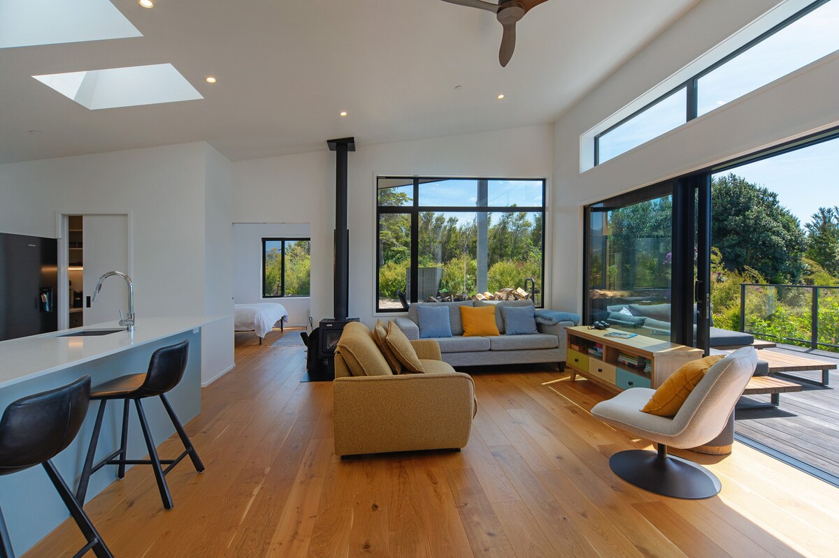 Kmetija Pōhutukawa je razkošno, svetlo stanovanje z osupljivim razgledom na zaliv Waimea. Velika okna, visoki stropi in prostor za sprostitev, ples ali uživanje v zunanji kopeli. Nahaja se na mirnem kmetijskem zemljišču s prijaznimi živalmi, zunanjim ognjem in mirno, minimalno notranjostjo, ustvarjeno za počasna jutra in čarovnijo zlate ure. Zasebno, elegantno in sproščeno - idealno za romantičen oddih ali vesel konec tedna z dobro glasbo, dobrim vinom in širokim odprtim nebom. Čista blaženost.