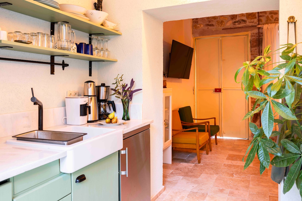 Naša kamnita hiša z zalivom je zasnovana tako, da udobno sprejme dve osebi ali majhne družine, zlasti s površino 55 m2, več kot 100 m2 lastnega vrta ter skupno parkirišče ter sadni in zelenjavni vrt. Ves dan lahko uživate v pogledu na Egejsko morje od skoraj kjerkoli v naši hiši; v naši kuhinji na prostem lahko uživate v večerji z okusnim razgledom pod drevesi s solato in žarom, ki ste ga pripravili z zelenjavo, ki ste jo zbrali z vrta.