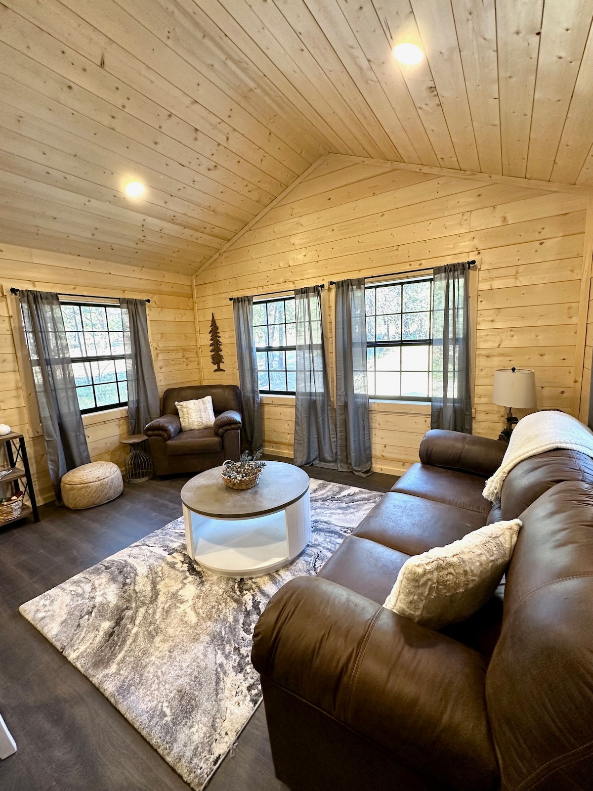 Kick back and relax in our cozy cabin. Built in 2021 and decorated with love to make you feel at home in the woods! Includes two bedrooms, two bathrooms, living room, full kitchen, loft with two queen-size beds, porch, and fire-pit. Enjoy sitting outside on the porch or share a drink and camp stories around the fire-pit. Books, TV and board games are available for in-home entertainment. If you're looking for a peaceful getaway, Darby’s Cabin is the place for you!