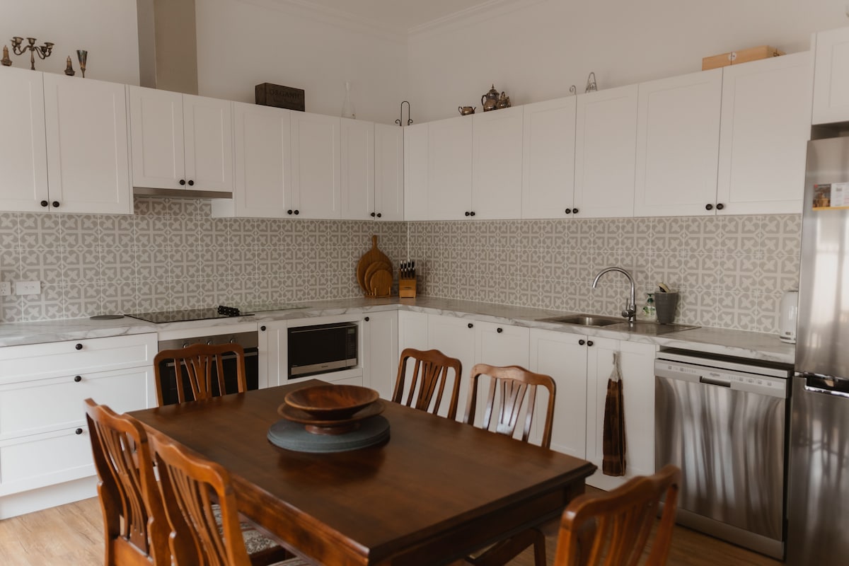 Gables je edinstvena hiška na deželi, ki je bila zgrajena leta 1885. Prvotno stavbo smo obnovili v 2 letih, nato pa jo podaljšali, da bi ustvarili sodoben, eleganten in sproščen dom. *10 minut vožnje do vinogradov in poročnih prizorišč. Ima veliko odprto kuhinjo, jedilnico in dnevni prostor s stropom katedrale, ki ustvarja prijeten, svetel in zračen prostor. Ne glede na to, ali sta na voljo 2 gosta ali največ 10 gostov, imate celotno hišo samo zase. Klimatska naprava v celotnem prenočišču.