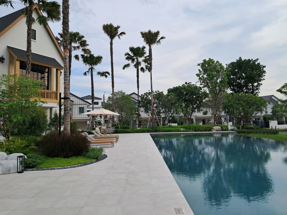Villaggio 3 is a private residence. Suitable for family and friends, there are 3 bedrooms, 4 beds, 3 bathrooms, kitchen, dining room, living room with complete amenities. Garden in front of the house, parking and security guards. The project is surrounded by nature, clean, peaceful, has camping, fitness, swimming pool and playground. Convenient transportation, only 30 minutes from Suvarnabhumi Airport, 15 minutes from motorway and expressway, 10 minutes from Mega Bangna, 20 min from BTS station.