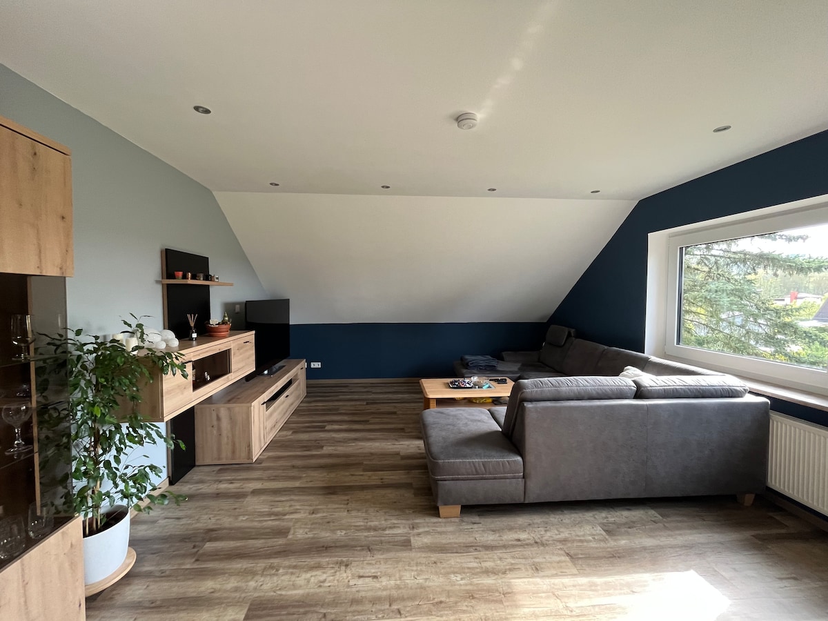 Prostorno 80 m² veliko stanovanje z 2 do 7 posteljami v naši skrbno prenovljeni polleseni hiši nad strehami Ziegenhagena vas vabi, da se zadržite in sprostite. Na balkonu uživate v čudovitem razgledu na gozd. Impozantna pollesena hiša sprejme 12 prijaznih ljudi v 3 generacijah za dober pogovor. Enako velja za moj catering, od koder je občasno na voljo tudi okusen obrok. V našem preddverju je knjižnica za smučanje na udobnih kavčih.
