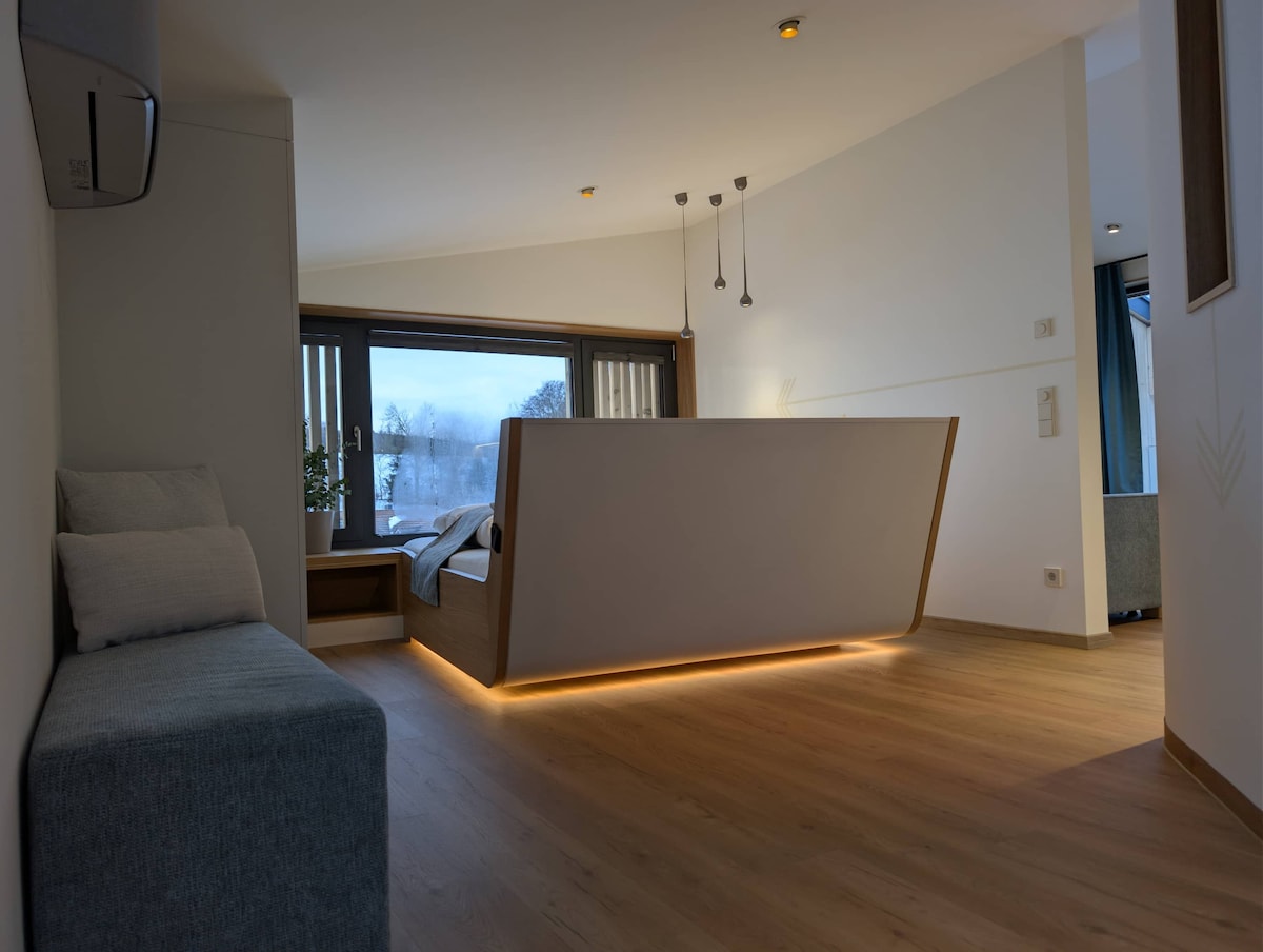 Uživajte v skupnem času v našem 256 m² velikem penthousu z masažno kadjo na strehi in panoramsko teraso XXL. Sprostite se v topli vodi in uživajte v osu, medtem ko občudujete osupljive gorske razglede in sosednjo destilarno Penninger. Idealno za družine in skupine, ki iščejo udobje, naravo in sprostitev. Ker je pot Saußbachklamm le nekaj korakov stran, je to idealno izhodišče za raziskovanje Bavarskega gozda.