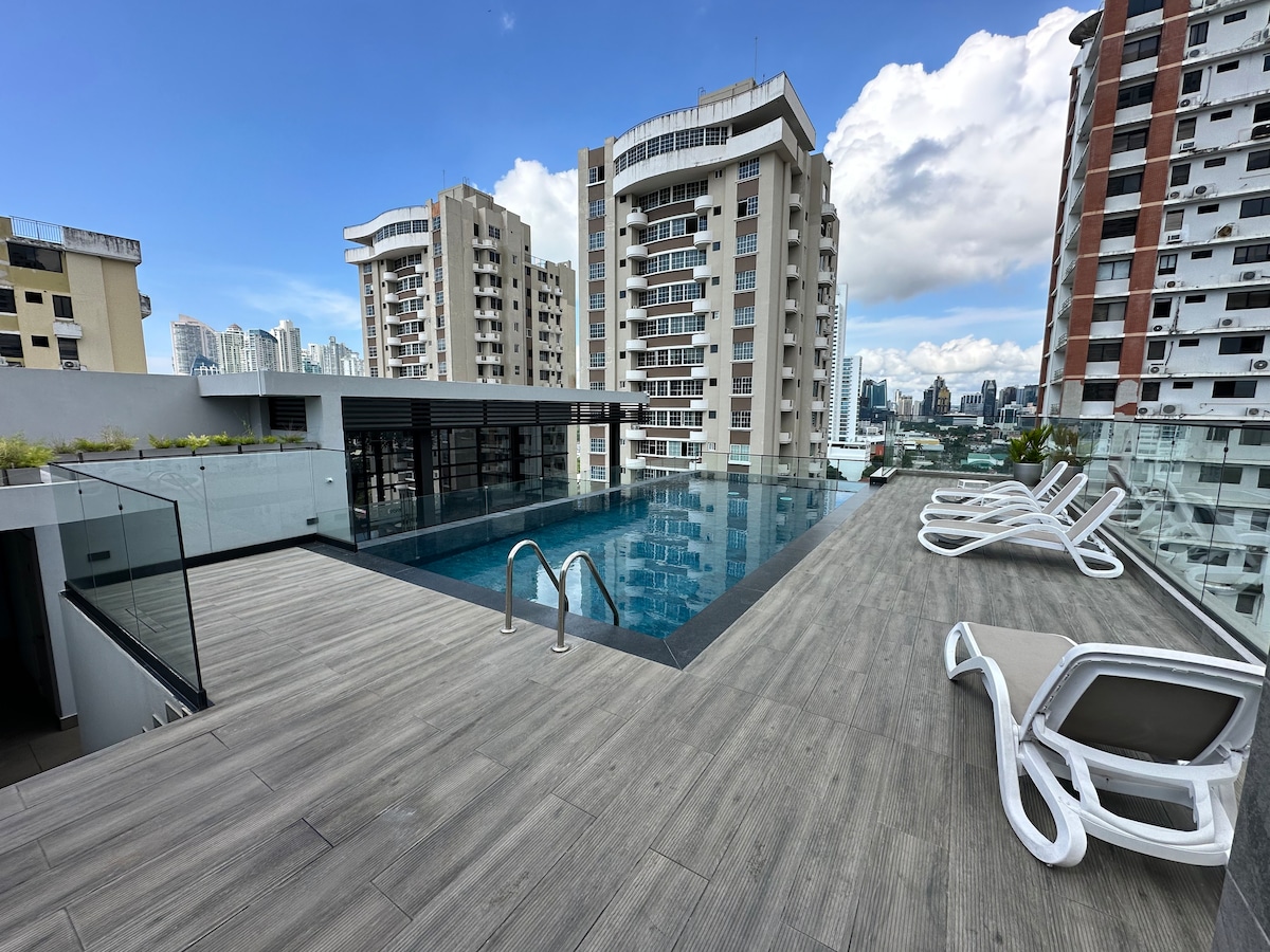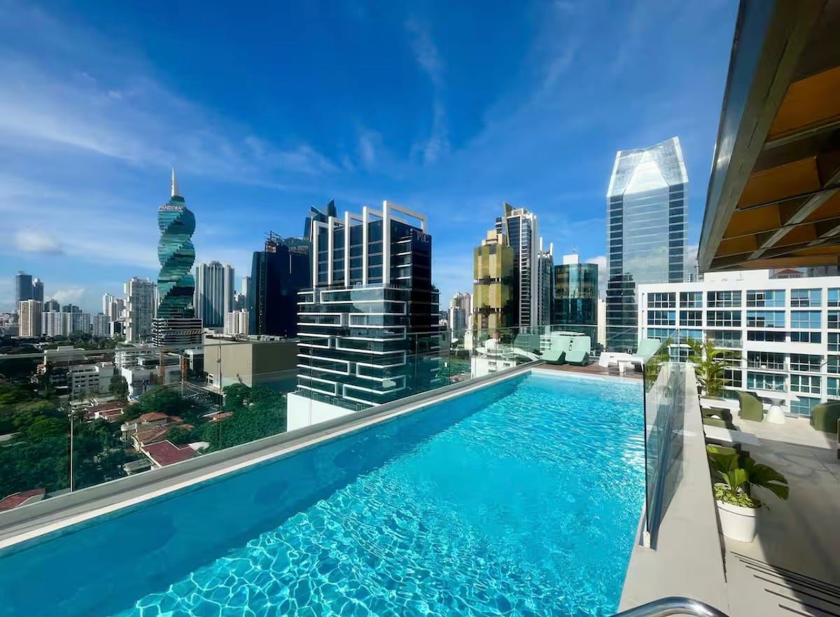 Sprostite se v tem sodobnem in svetlem stanovanju s panoramskim razgledom na mesto, bazen in streho, ki se nahaja na ulici Calle 50 v enem najbolj osrednjih in priročnih območij Paname Odkrijte udobno in varno izkušnjo v osrčju mesta, le nekaj korakov od starega mestnega jedra in postaje podzemne železnice Iglesia del Carmen. Njegova odlična lokacija vas povezuje z nakupovalnimi območji, restavracijami, obalnim pasom in glavnimi znamenitostmi mesta