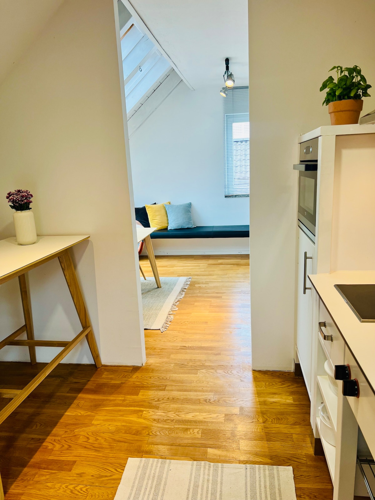 Gre za 80 m² veliko podstrešno stanovanje v 2 nadstropjih (1. nadstropje: hodnik, garderobna omara, vgrajena omara, prha/WC, 2. nadstropje: predelano stanovanje s popolno kuhinjo, barom, jedilno mizo, kavčem (ali raztegljivim kavčem), pisalno mizo, kaminom, zakonsko posteljo, kopalnico (WC/kad/pralni stroj) in zložljivo posteljo, če je potrebno. Monoblock Klimabox. Mirno stanovanjsko območje v soseski tik ob robu gozda. Parkiranje je vedno enostavno povsod. S-Bahn 7 min hoje ali 1 min avtobusa. 15 min vožnje do Marienplatza.