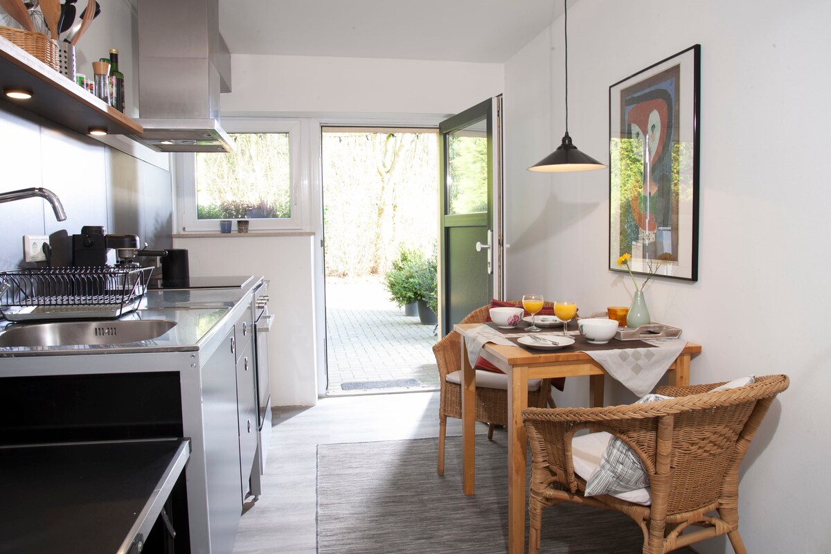 Ločeno zunanje stopnišče (1. nadstropje) vas vodi do popolnoma lociranega stanovanja v samostojni hiši. Na popolnoma mirni lokaciji, vendar le 8 minut od centra (kolesa lahko najamete, 10,00 €/We), navdušuje s kuhinjo 1a, sodobno kopalnico (BD, talno ogrevanje), savno na zahtevo, teraso s pogledom na vrt/ tendo, vsestranske žaluzije, prostorno spalnico in svetlo dnevno sobo z dostopom do terase. Idealno tudi za daljša bivanja (delovni prostor z mizo).