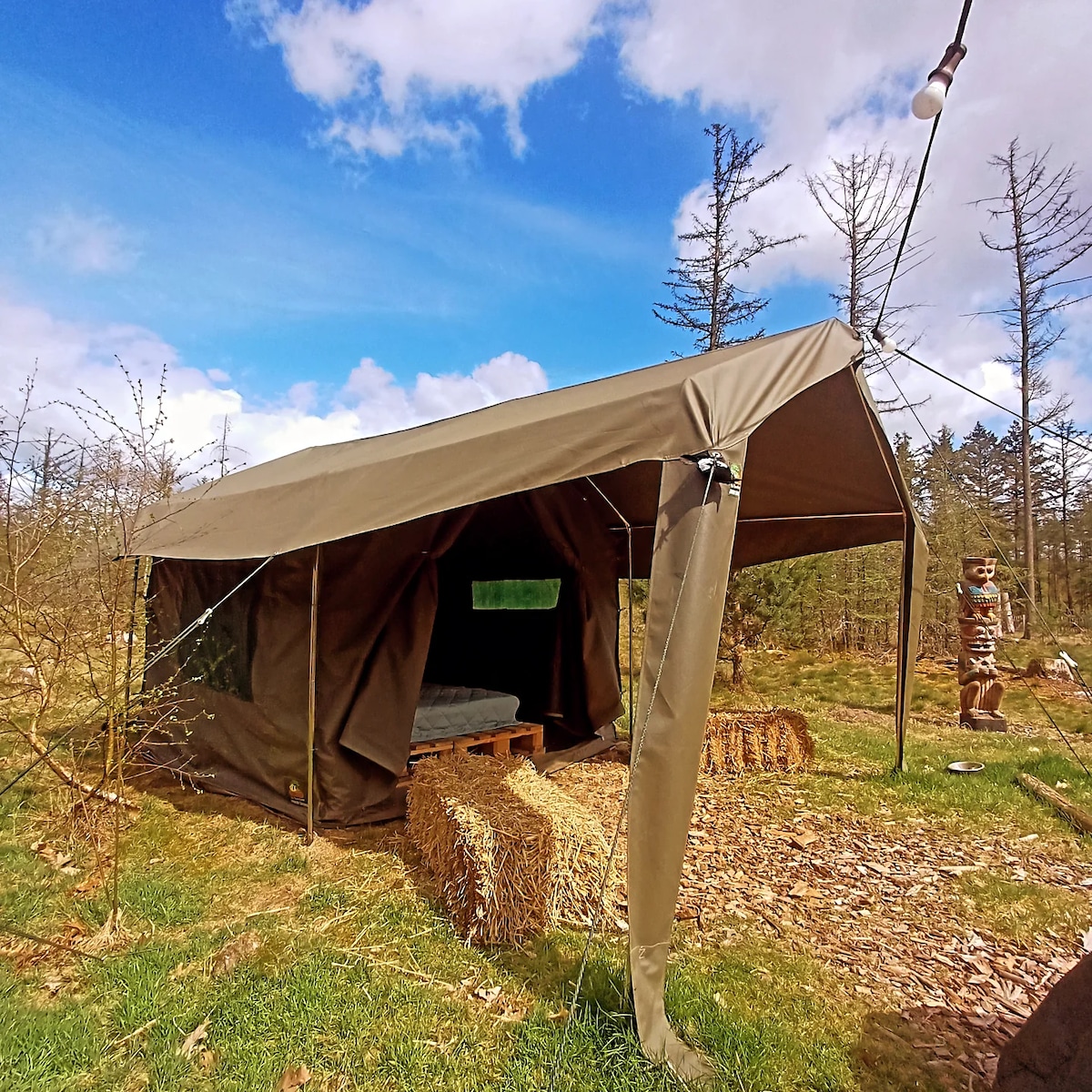 Na robu velikega gozdnega območja ta šotor Safari lahko sprejme 4 osebe. Šotor ima zelo prostoren zeleni vrt, sedi sredi zelenja in ima svoj žar in ognjeno skledo. Življenje na prostem v optima formaciji, opremljeni z vsemi udobji! Zasebni vhod in parkirno mesto ter obsežna oprema (kuhinja, vodovod in štedilnik na pelete) dopolnjujejo to edinstveno lokacijo. Šotor za safari je opremljen z: posteljnino, brisačami, gelom za prhanje, šamponom, milom za roke, milo za posodo.