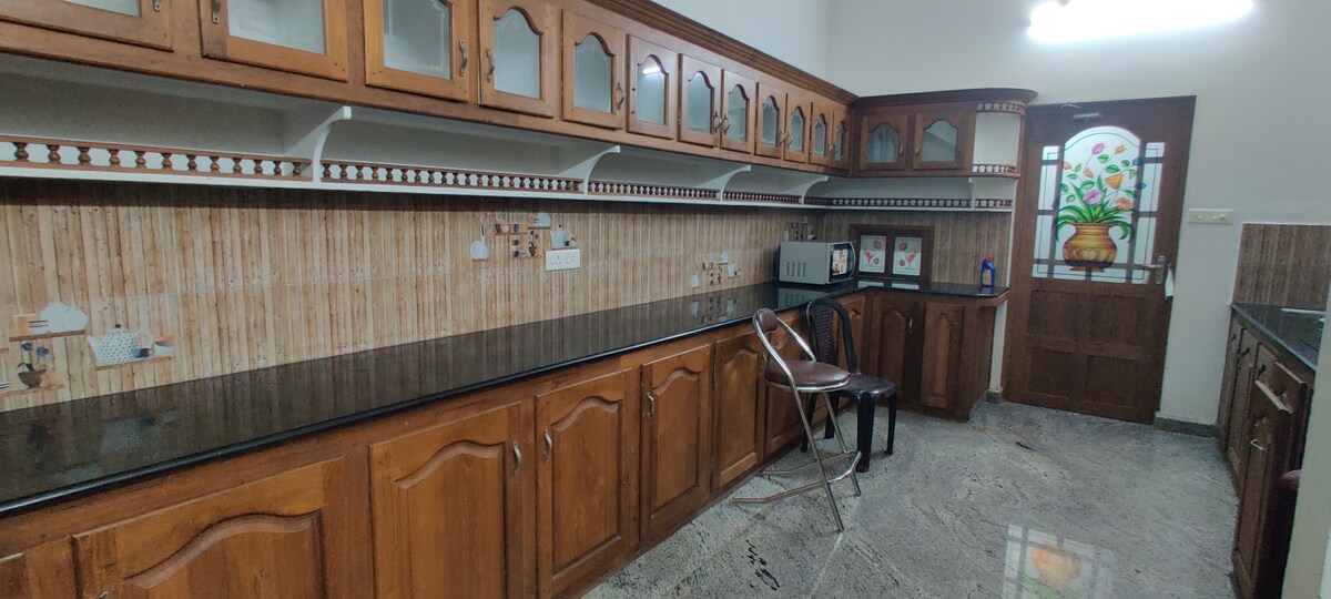 Udoben dom, le 8 km od mesta Thrissur, železniške postaje, mednarodnega letališča Kochin (42 km), blizu nakupovalnega središča Hilite, doma za ostarele Vaidyarathnam Ayurveda. Ostanite hladni v spalnicah s klimatsko napravo, Wi-Fi-jem,pametno televizijo in kuhajte v popolnoma opremljeni kuhinji. Idealno za krajša in daljša bivanja. Spalnice s klimatsko napravo – 2 – postelje s svežo posteljnino, prostorna omara Kuhinja – štedilnik, kuhinjski pripomočki, posoda, hladilnik, čistilec vode, jedilnica Kopalnica – Čisto, preprosto, ima gejzir, na voljo so sveže brisače dnevna soba – Wi-Fi, pametna televizija, kavč