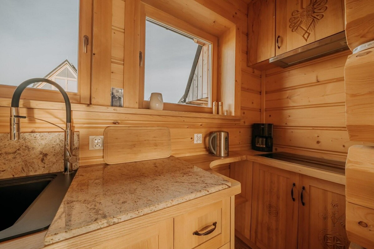 A luxurious chalet with a beautiful view of the Tatra Mountains panorama for 4 or 6 people located on Salamandra (Kościelisko). - two lockable bedrooms with double beds, - two bathrooms with a shower (one additionally with a bathtub), - a living room with a sofa bed for 2 people with a terrace, - a kitchenette with a coffee machine, induction, fridge, dishwasher, dishes. There is a free self-service electric sauna outside. Each chalet has two free parking spaces assigned.