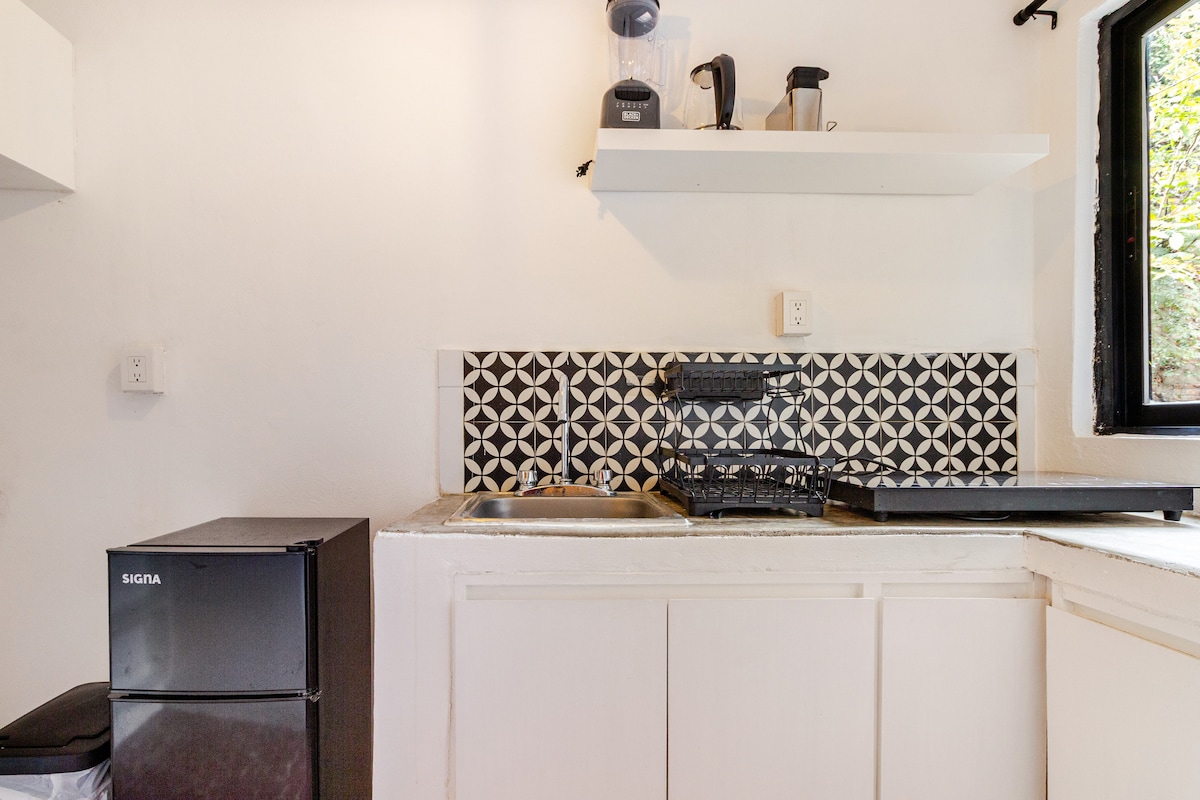 Enjoy a stylish experience at this cozy studio apartment in the heart of Querétaro City center. Perfect location if you are visiting the city. Walking around the area you can find restaurants, bars, cafes, museums, stores and much more. The apartment has a fully equipped kitchen, spacious full bathroom, cozy bedroom with TV, AC, closet and a working space. It also has a shared entrance, small shared patio with an outdoor dining table, and a lot of plants to make you feel at home.