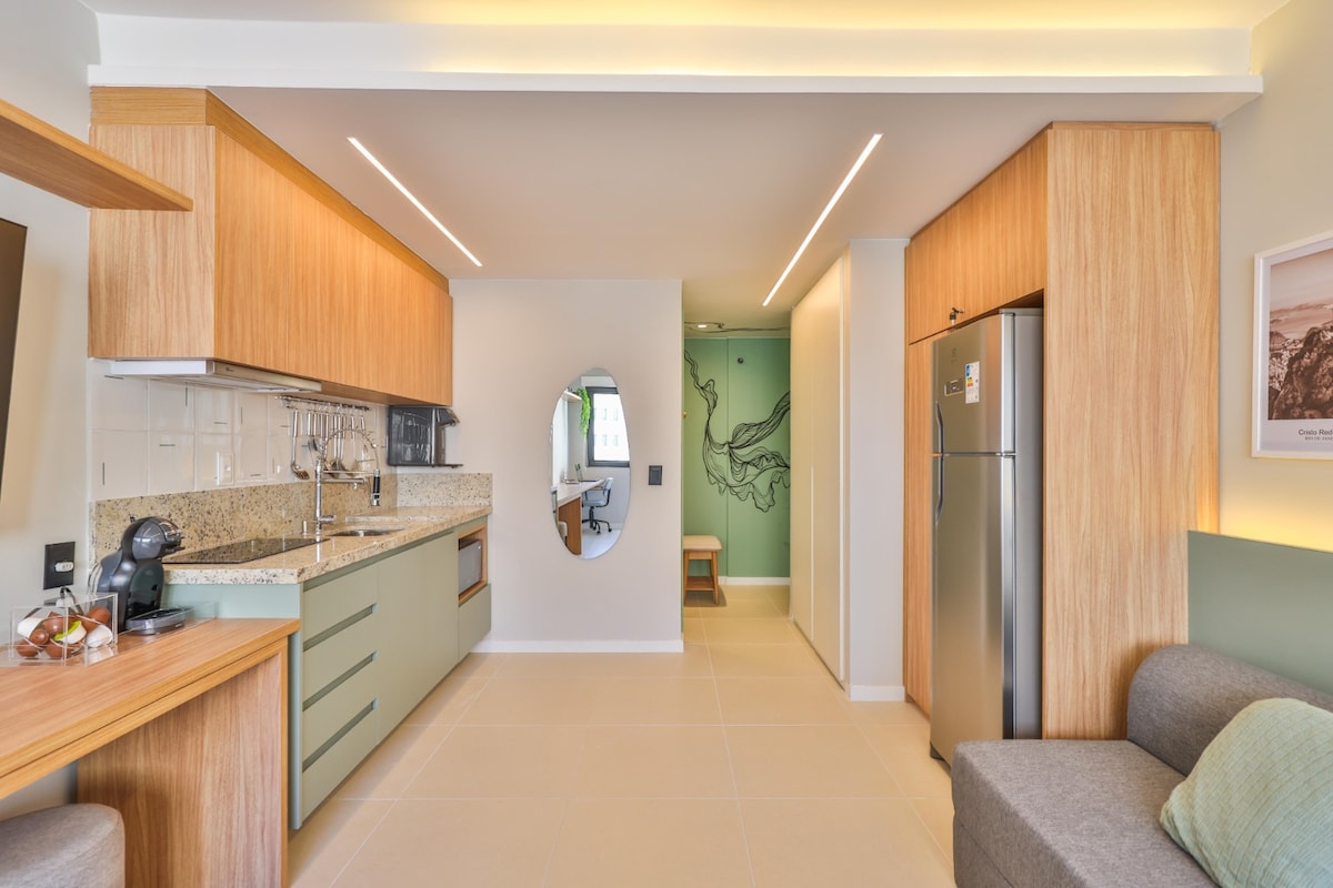 Očarljiva in tiha garsonjera velikosti 25 m2, popolnoma opremljena, z visokokakovostno kuhinjo, kopalnico in spalnico ter akustičnim oknom z 95-odstotnim zmanjšanjem zunanjega hrupa. Studio je popolnoma inteligenten in odziven na glasovne ukaze (TV, zvok, temperatura in osvetlitev). Naš prostor se nahaja v osrčju plaže Copacabana, le nekaj minut hoje od plaže Ipanema, supermarketov, podzemne železnice in številnih barov in restavracij v najboljšem slogu Ria!