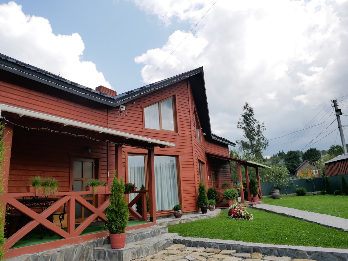 Ponujamo hišo v obliki črke A v vasi Kvasi, v bližini sanatorija »Mountain Tysa«(približno 1,8 km., Bukovel-35 km.,Dragobrat -10 km.). Storitve: velika poletna terasa z žarom in udobnim pohištvom,dve spalnici z 2 zakonskima posteljama, delovna pisarna z zložljivim kavčem, 1 kopalnica s pralnim strojem , kuhinja z vso potrebno opremo za kuhanje, sprejemnica z velikim kaminom in pohištvom za sprostitev). Pri nas vam bo udobno in udobno.