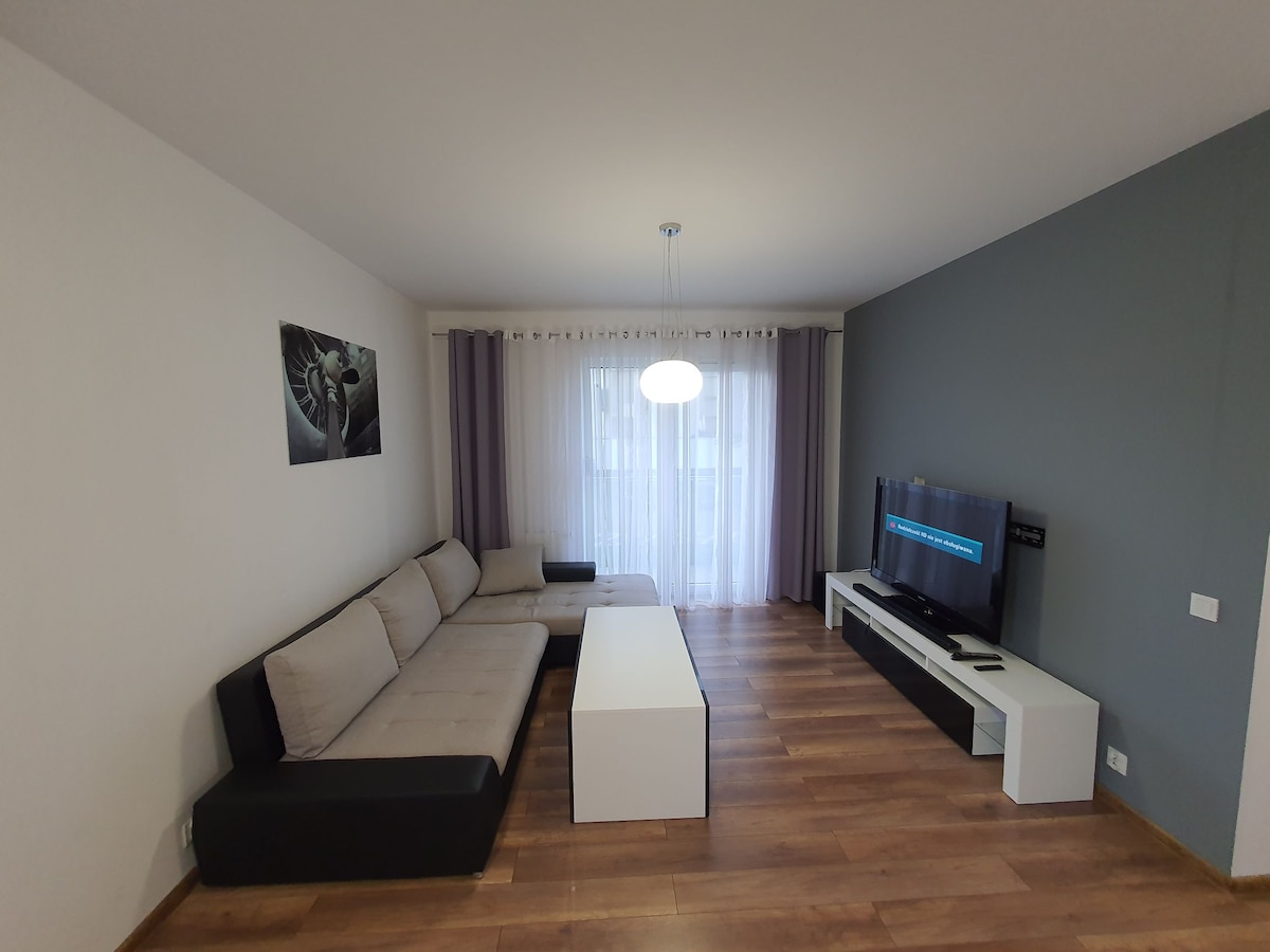 52 m2 veliko stanovanje z velikim balkonom, v pritličju. Na voljo je popolnoma opremljena kuhinjska niša: pomivalni stroj, pralni stroj, hladilnik, pečica, jedilni pribor, kozarci, lonci in ponve. Prostorna dnevna soba z velikim zložljivim kotom, omaro, knjižno omaro s predali, televizorjem z Netflixom in brezplačnim Wi-Fi-jem. Spalnica z zakonsko posteljo velikosti 140 cm. Kopalnica s prho. Brezplačno javno parkiranje 24 ur na dan